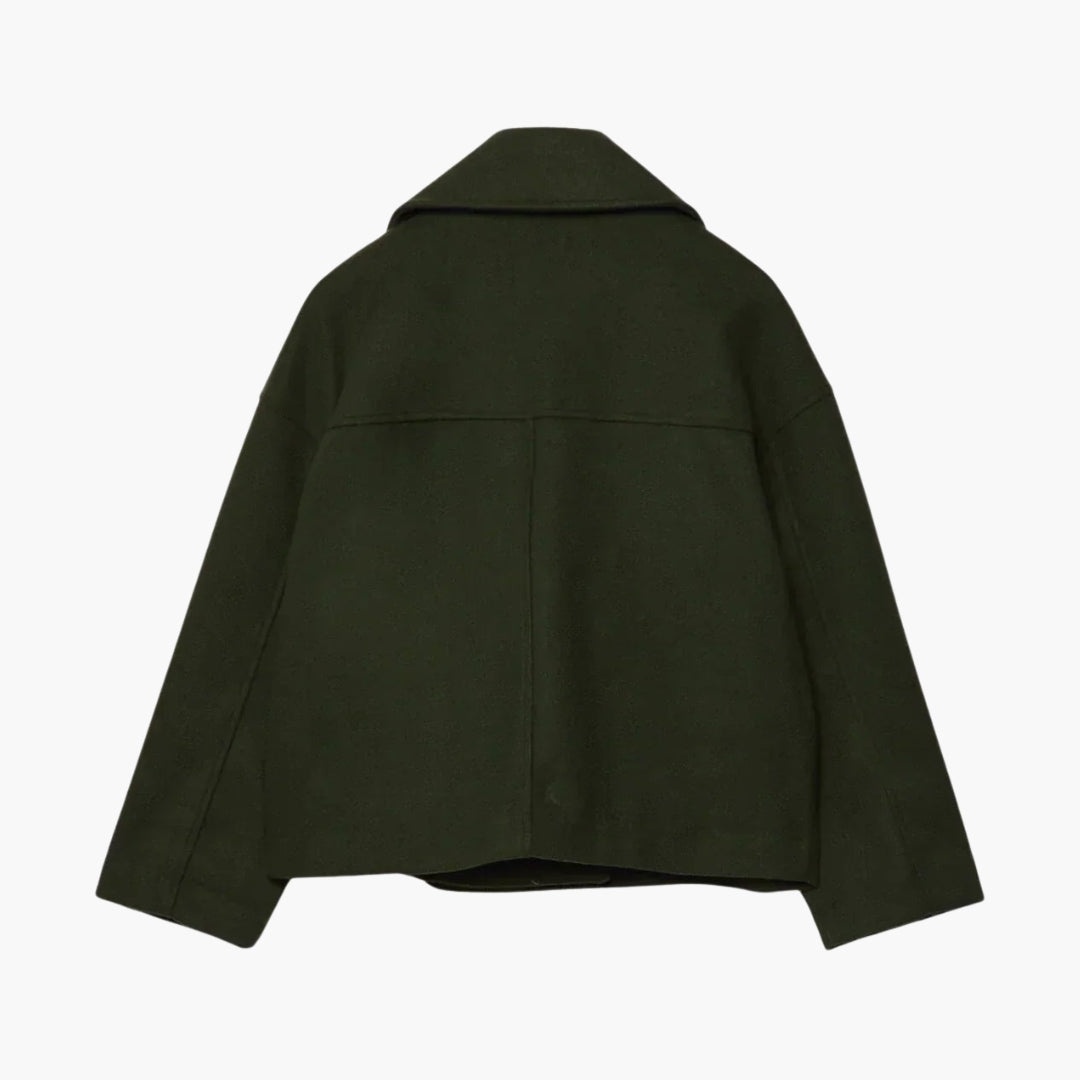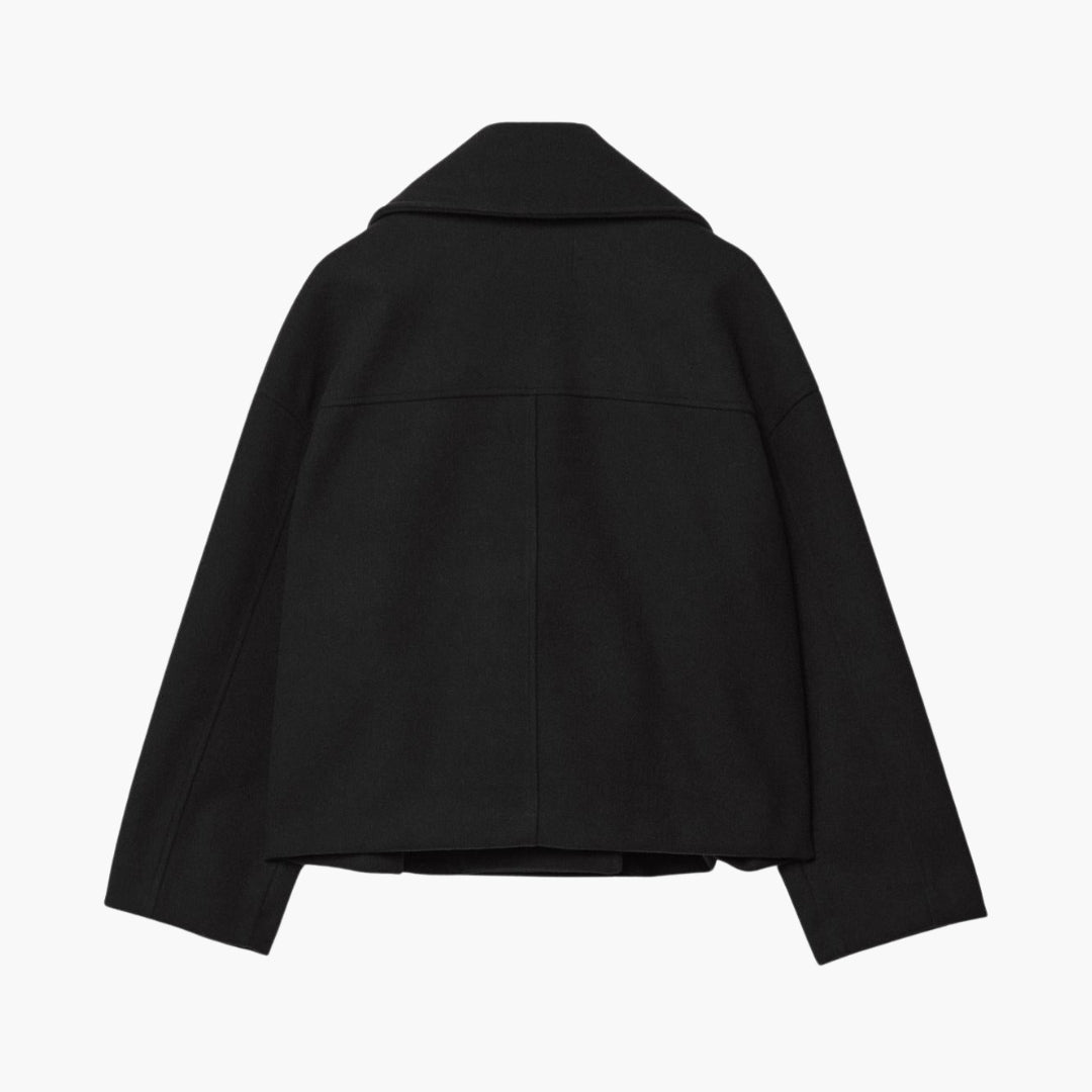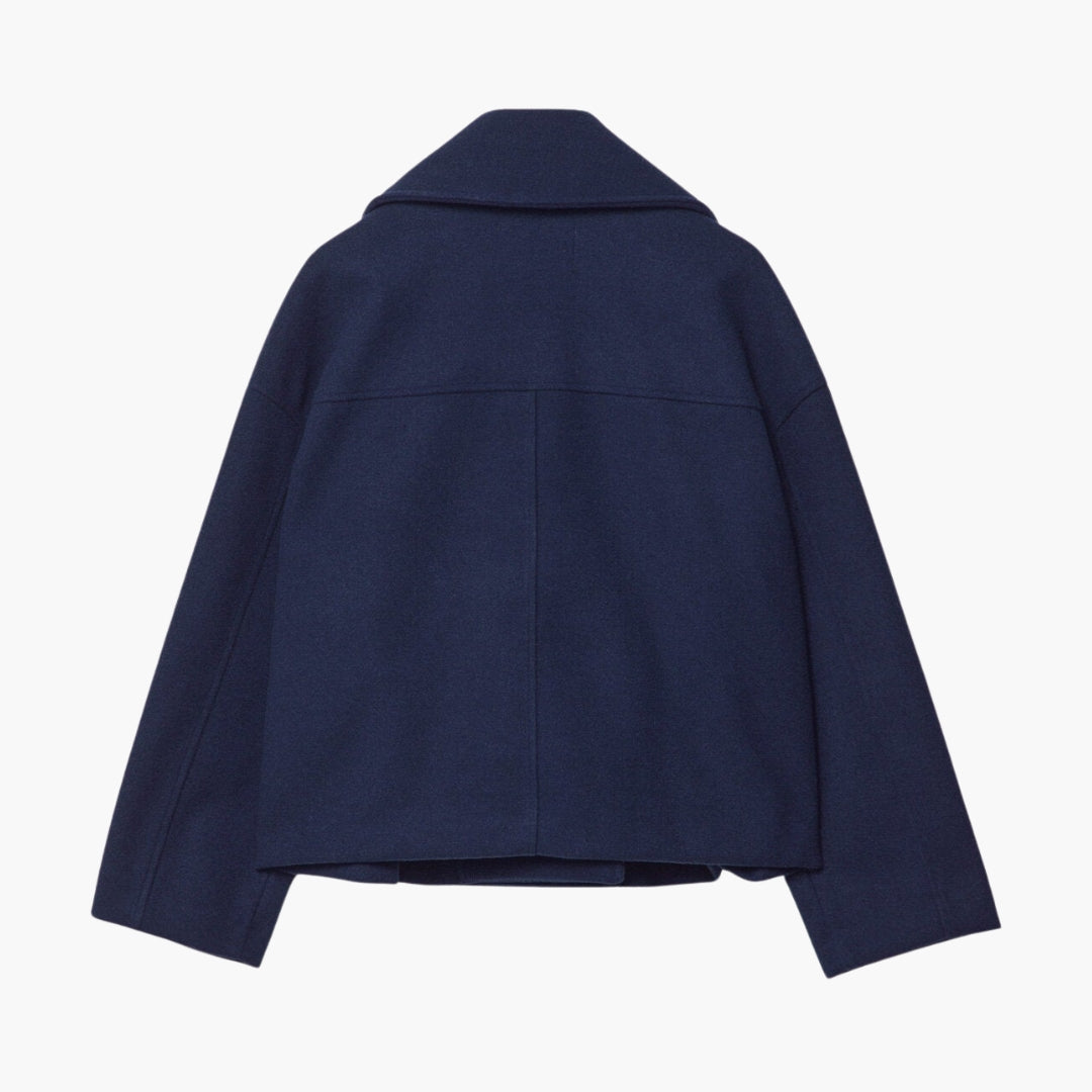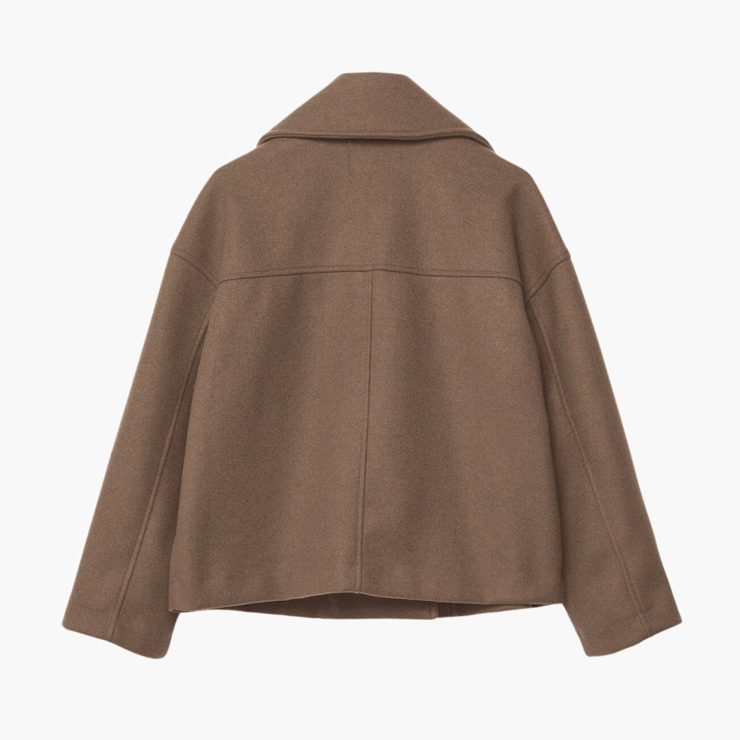 Questa giacca corta da donna presenta un ampio colletto con risvolto che conduce a una chiusura incrociata con bottoni. Due tasche verticali con piping sono posizionate sul davanti. La giacca ha maniche lunghe e un orlo dritto. La sua superficie tessuta solida conferisce un aspetto ordinato, adatto per essere stratificato o indossato da solo per fare una dichiarazione di stile.