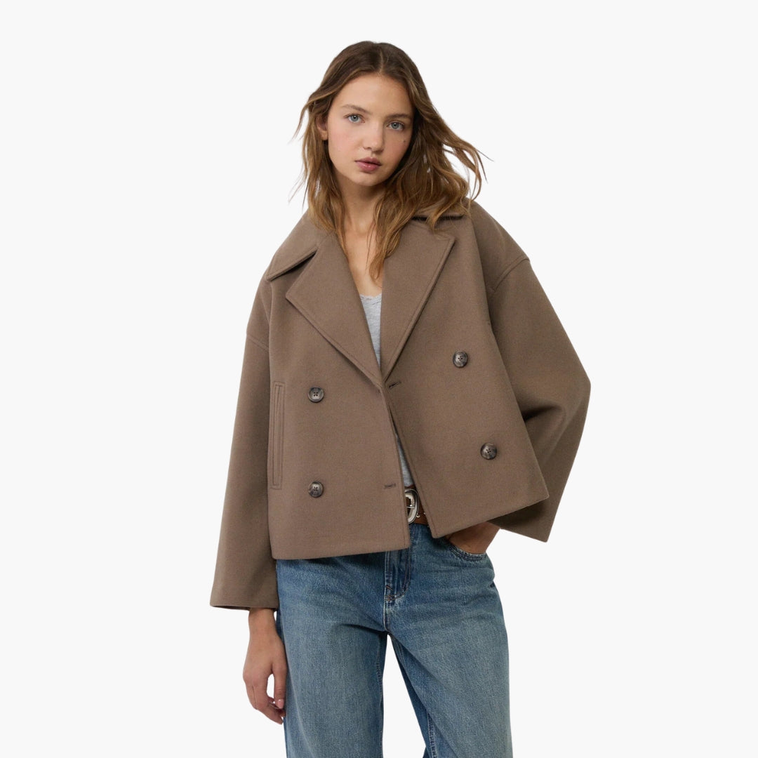 Giacca corta da donna con chiusura incrociata, colletto con ampio risvolto e tasche con piping.