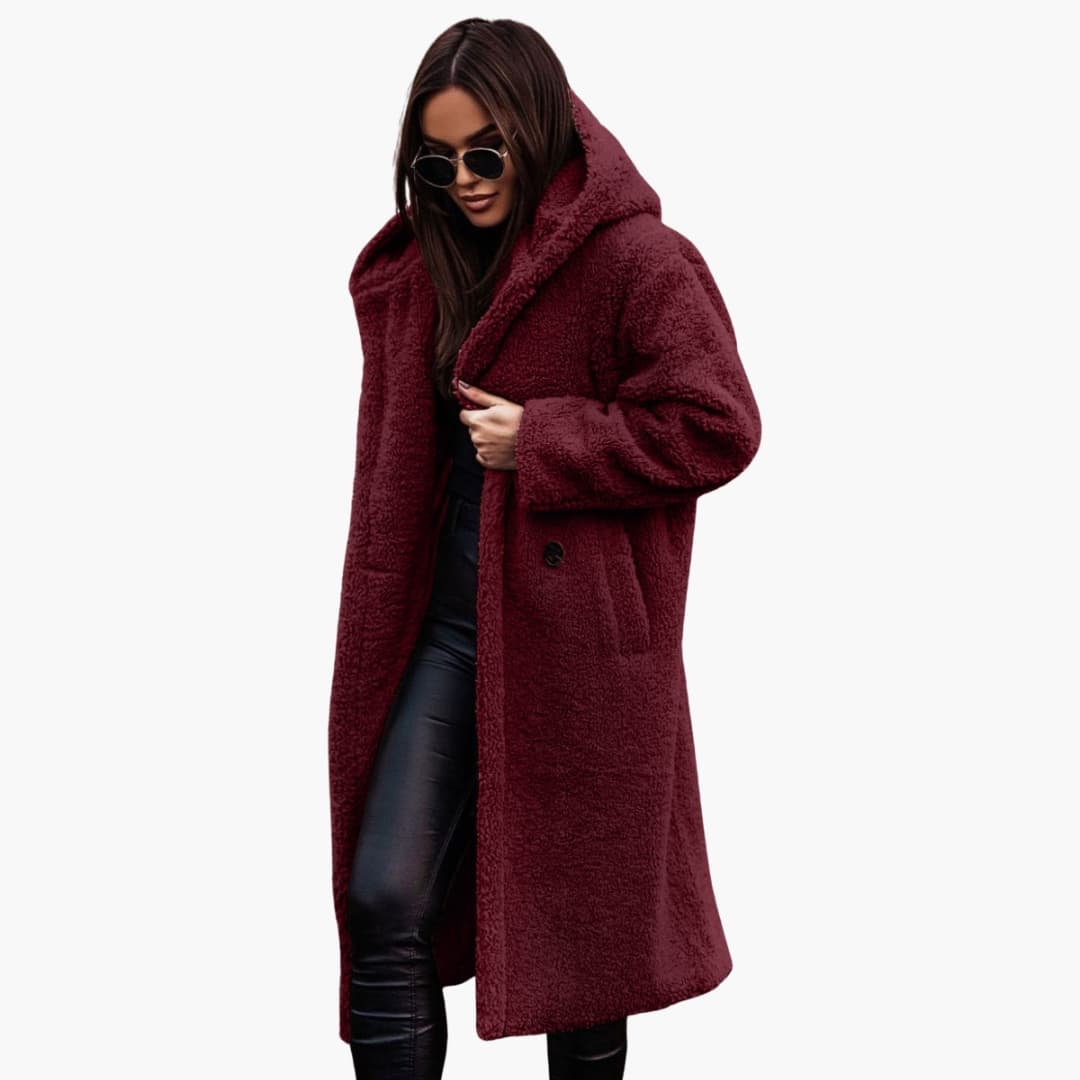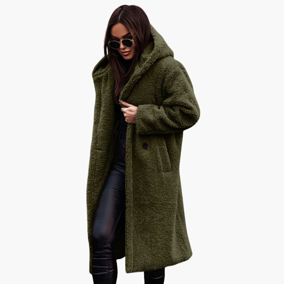 Lange teddypluche damesjas met capuchon en knoopsluiting