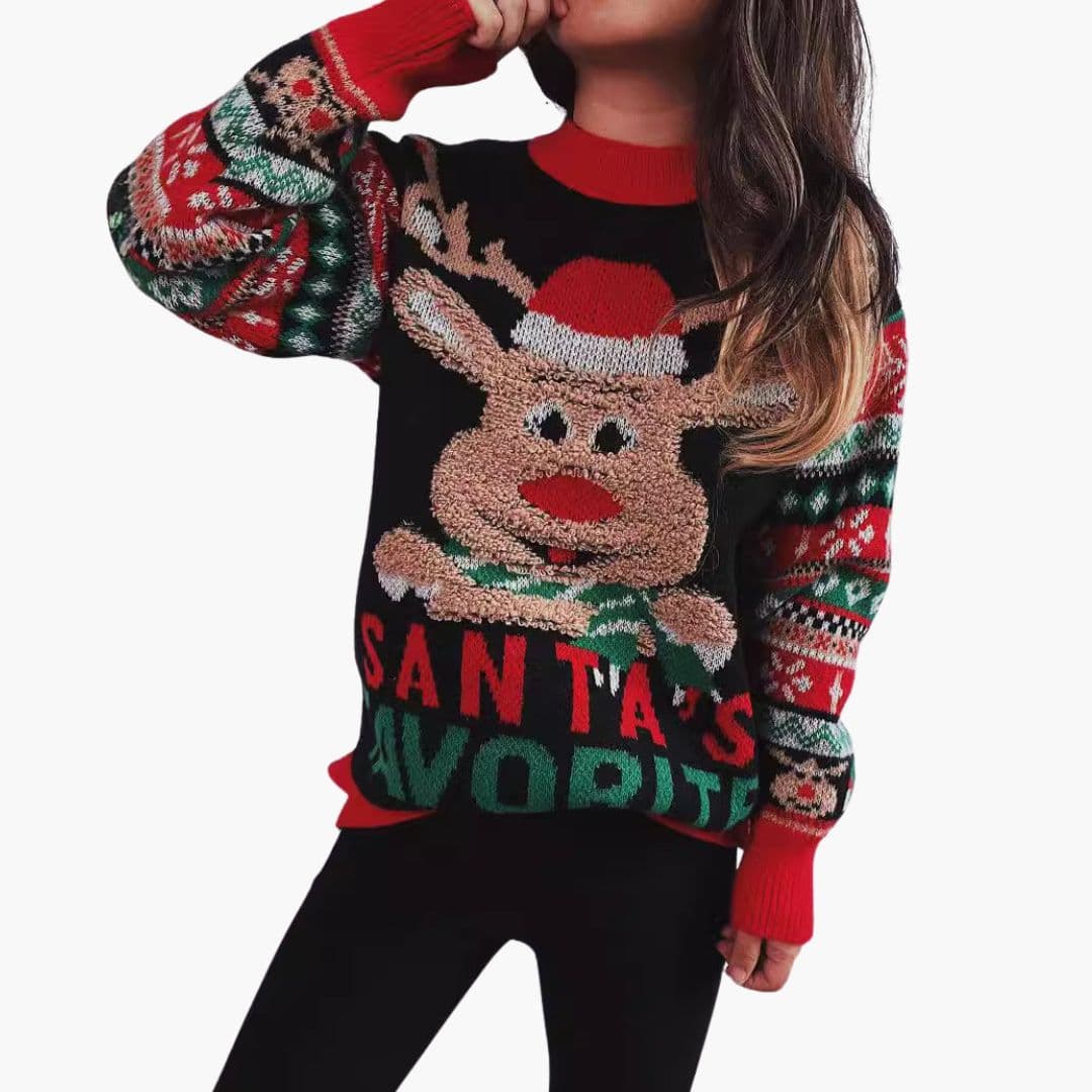 - Patroon: Gebreide stof versierd met een groot rendiermotief, vergezeld van kleurrijke elementen en geïntegreerde letters.