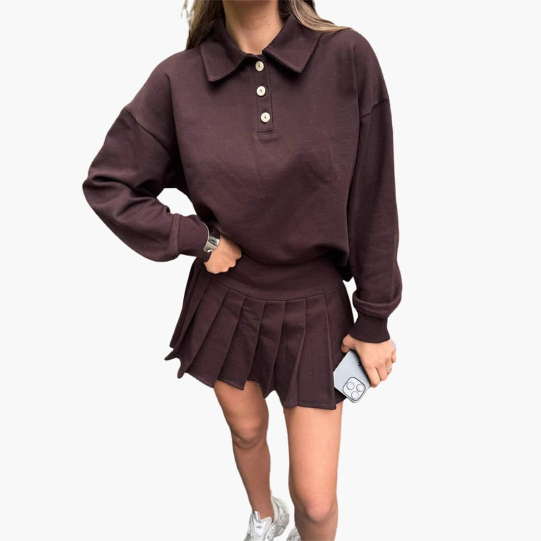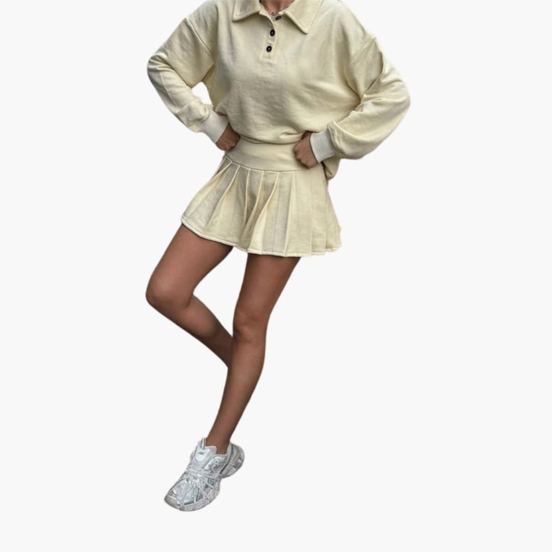 Dames polojurk met knoopsluiting bij de kraag en geplooide rok