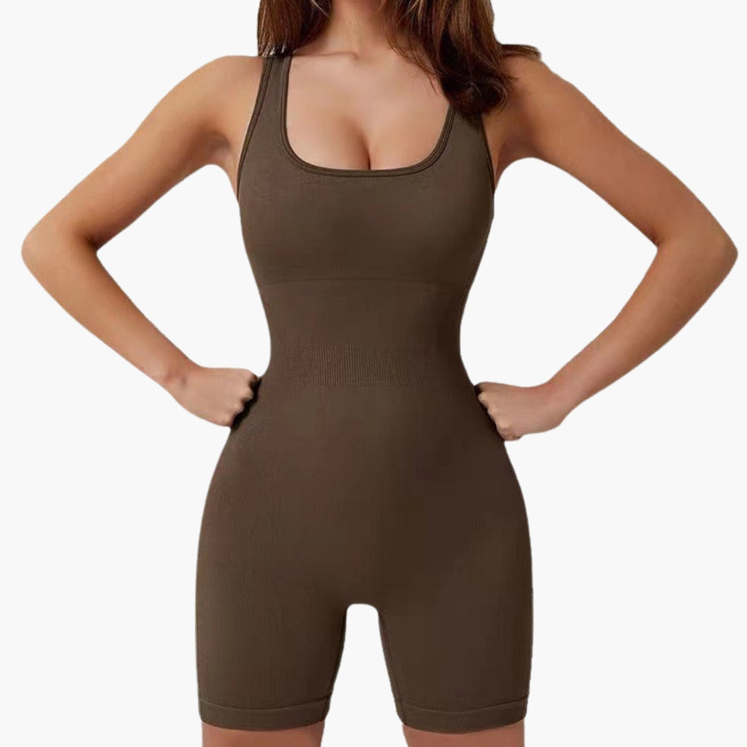 Dames Ribgebreide Sport Jumpsuit met Scoop Hals en Korte Benen.