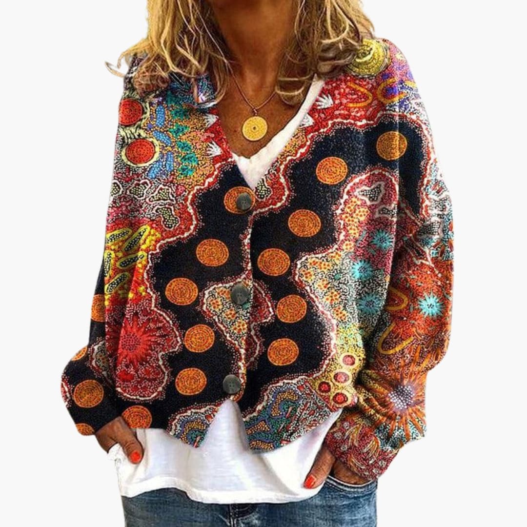 Denne genseren for kvinner har et fargerikt strikkedesign med ulike mønstre som dekker hele plagget. De lange ermene og rette kanten gir en ryddig finish. Silhuetten er rett, noe som gjør det mulig å bruke lag-på-lag med andre plagg ved behov. Denne modellen passer til forskjellige antrekk for hverdagsbruk.