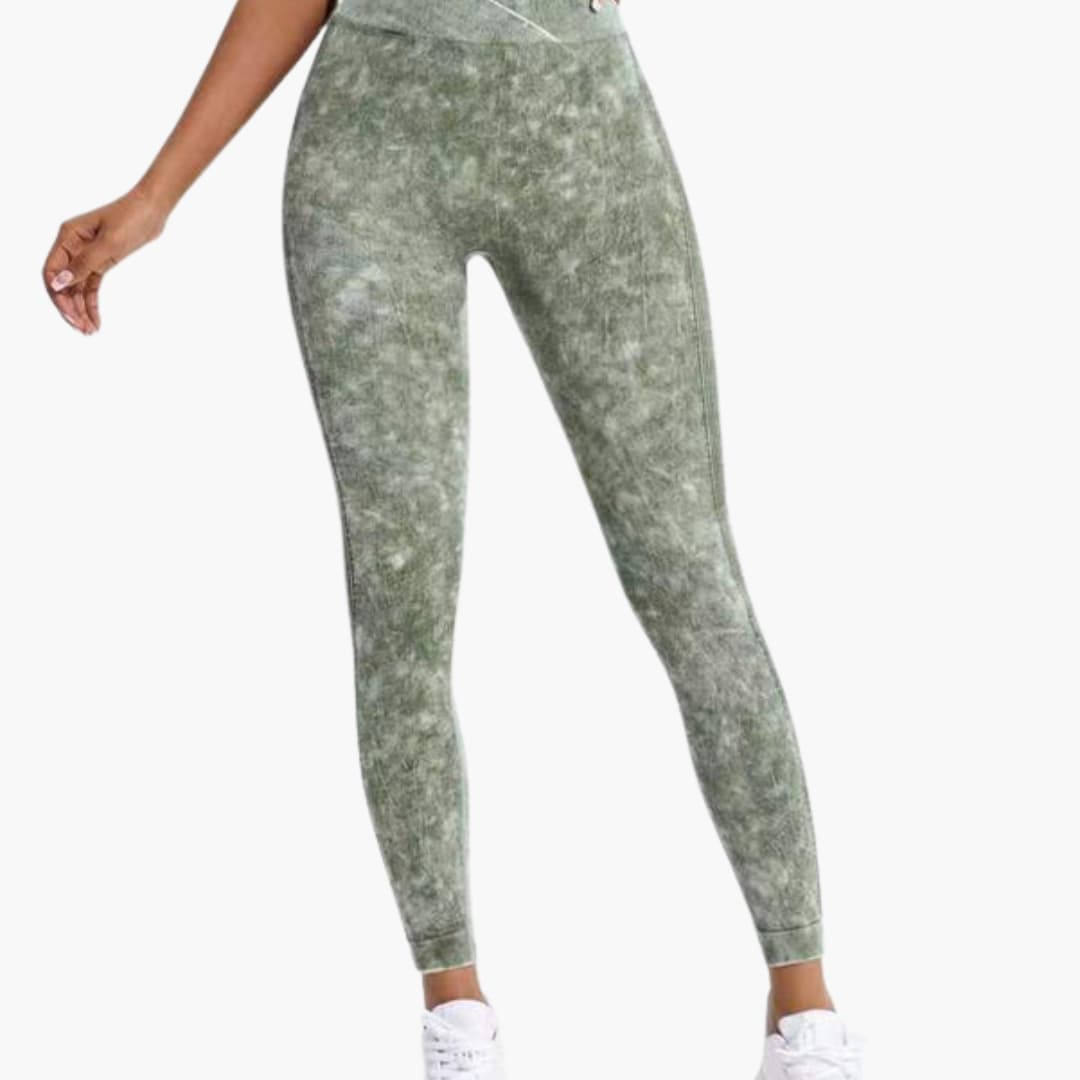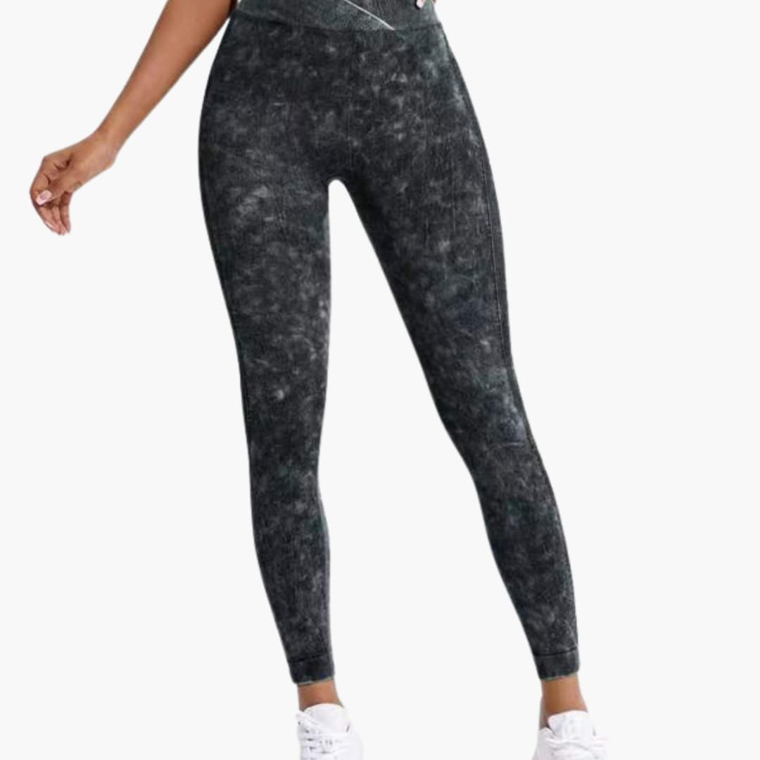 Disse treningsleggingsene for kvinner har en høy elastisk midje med et påtrekksdesign, uten synlig lukking. Modellen har ingen lommer og lange ben med en rett kant. Overflaten er teksturert med en marmoreffekt, samtidig som den opprettholder et jevnt utseende gjennom hele plagget.