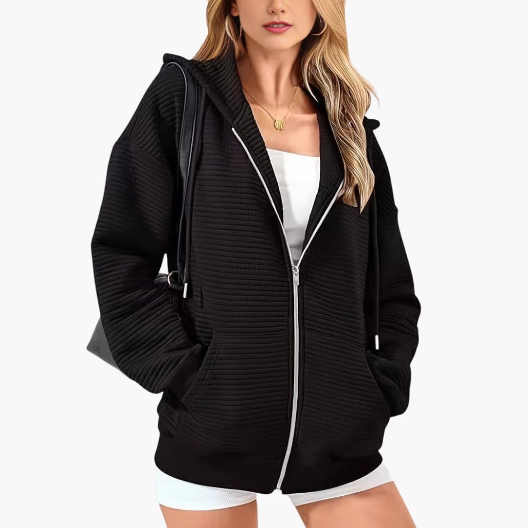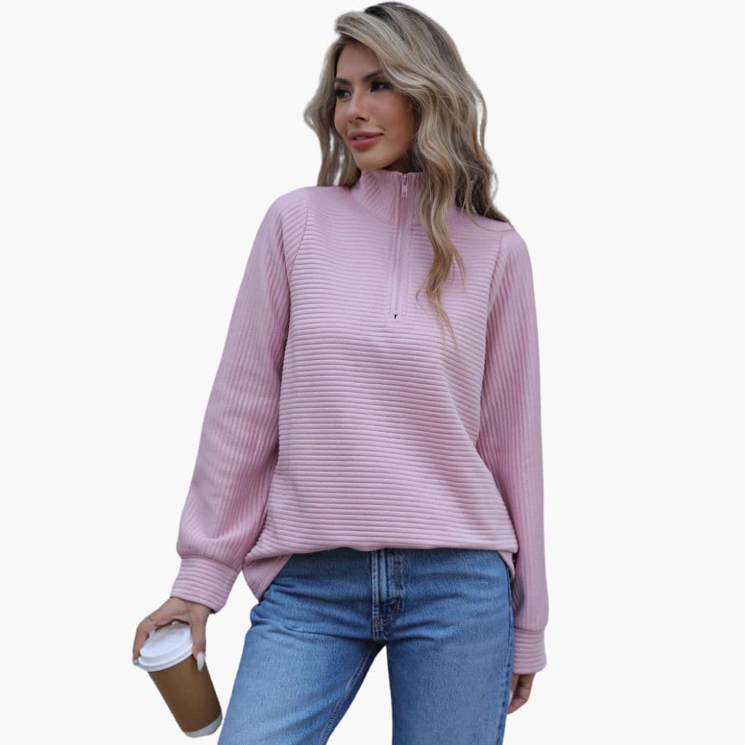 Denne damegenseren har en ribbestruktur og en halv glidelåskrage med middels høyde. Den har vide ermer og en løs passform. Stilen passer godt sammen med jeans eller leggings, noe som gjør den egnet for ulike anledninger.