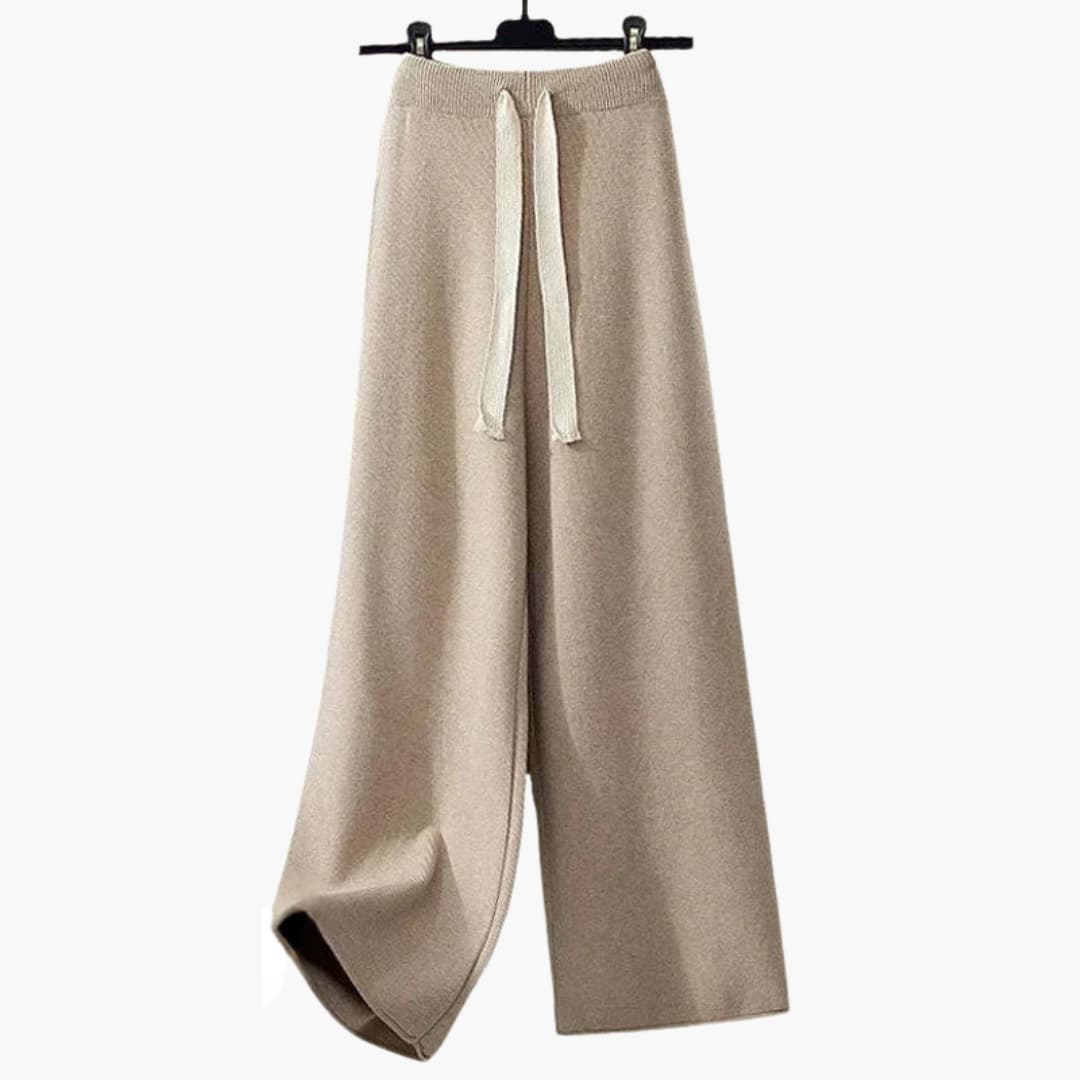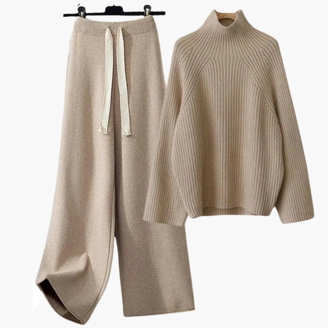 Dwuczęściowy zestaw dzianinowy dla kobiet z bluzką z wysokim kołnierzem i spodniami o szerokich nogawkach