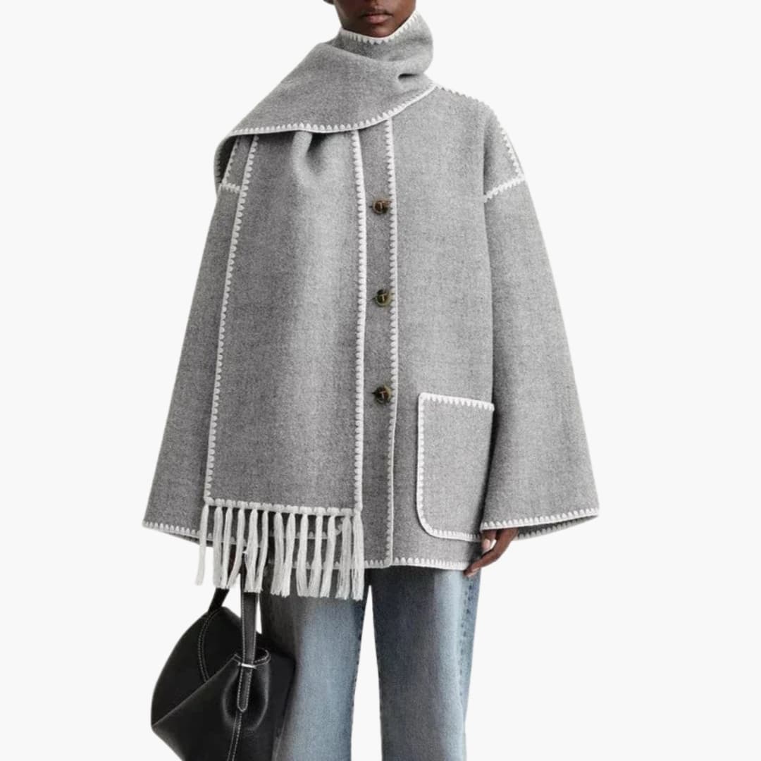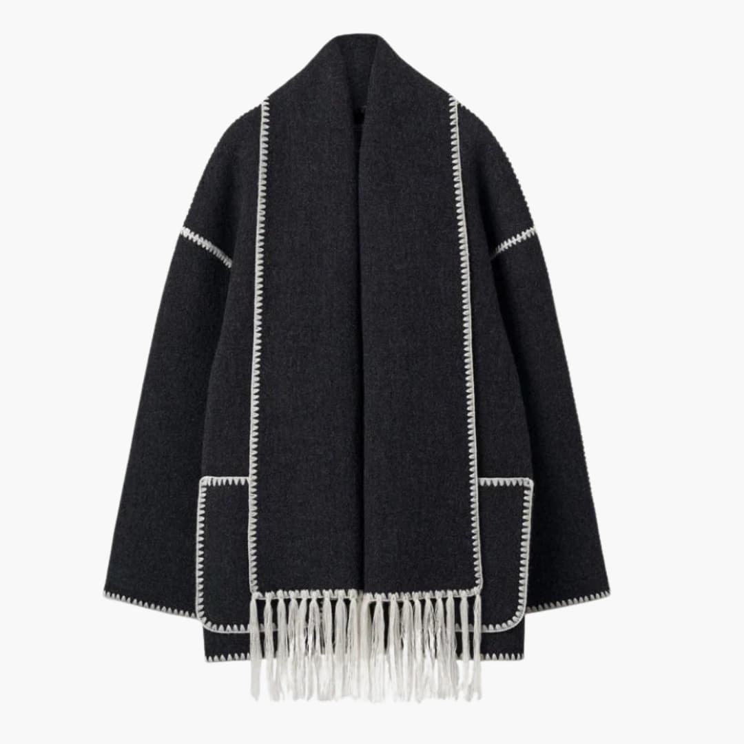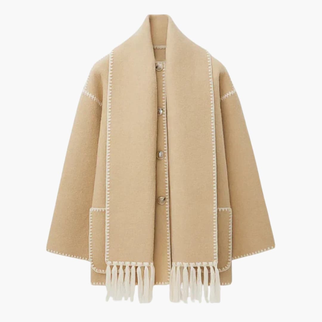 Płaszcz damski z dwurzędowym zapięciem i tkanym wykończeniem