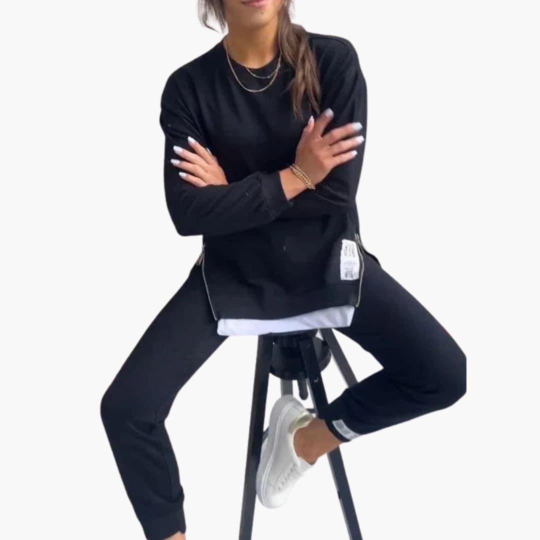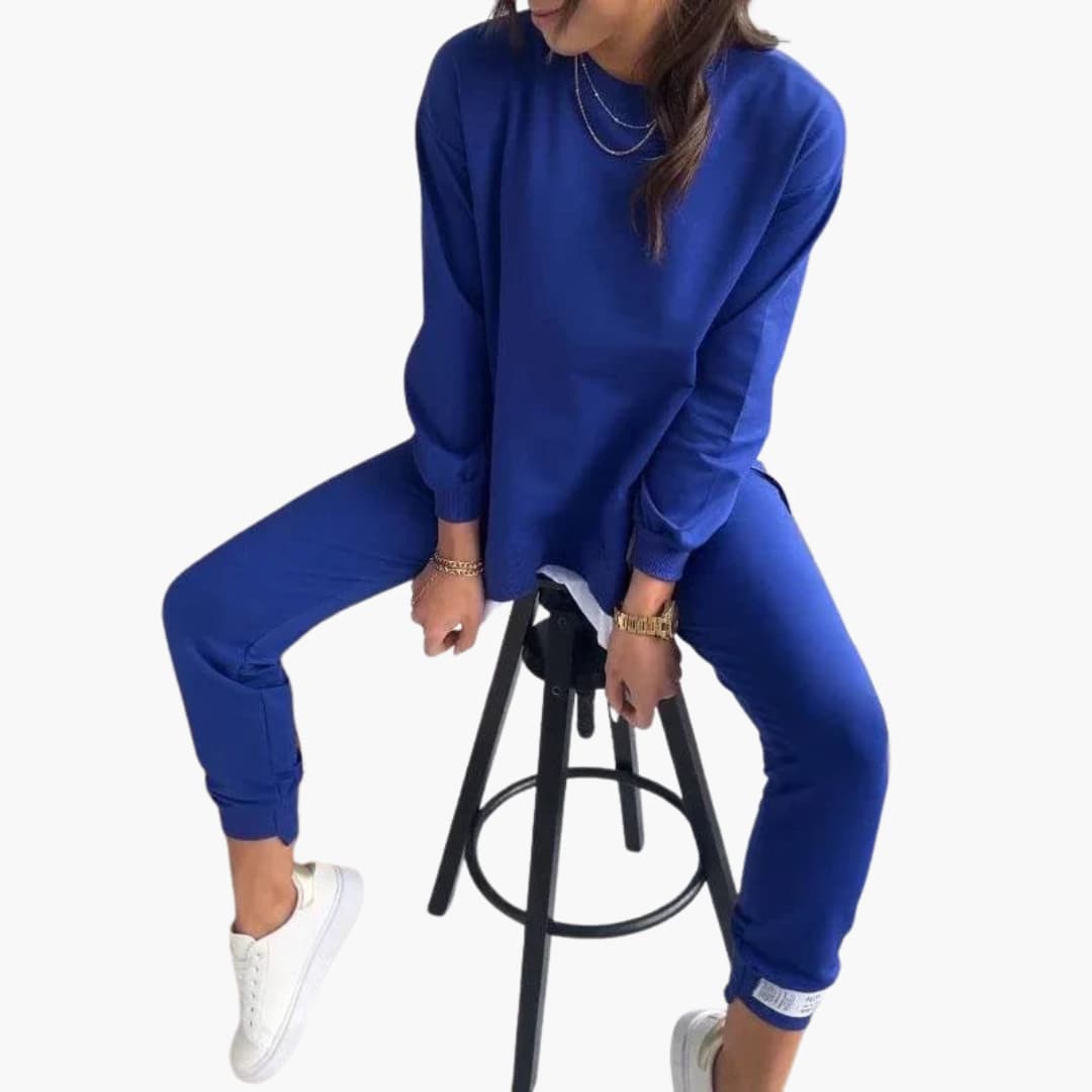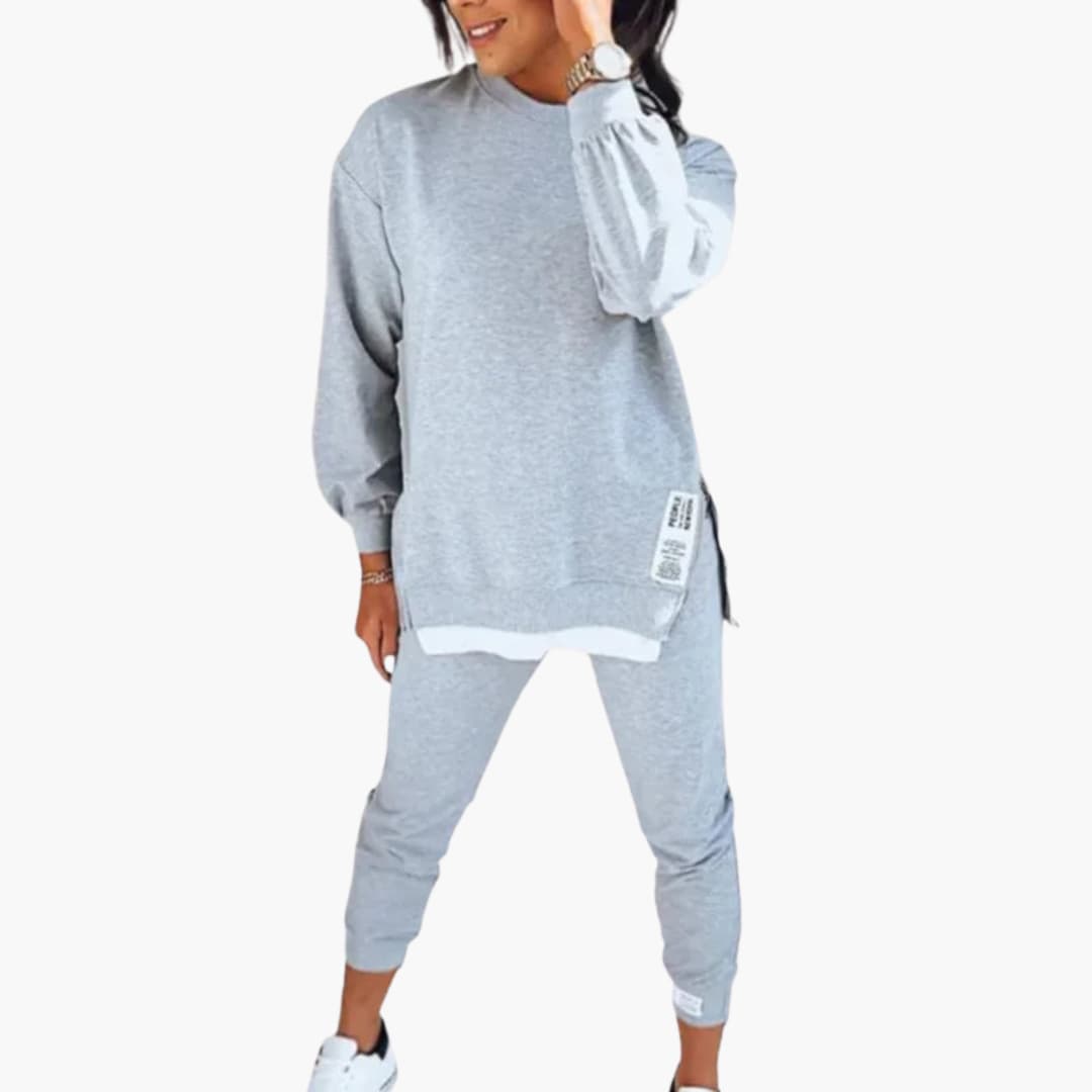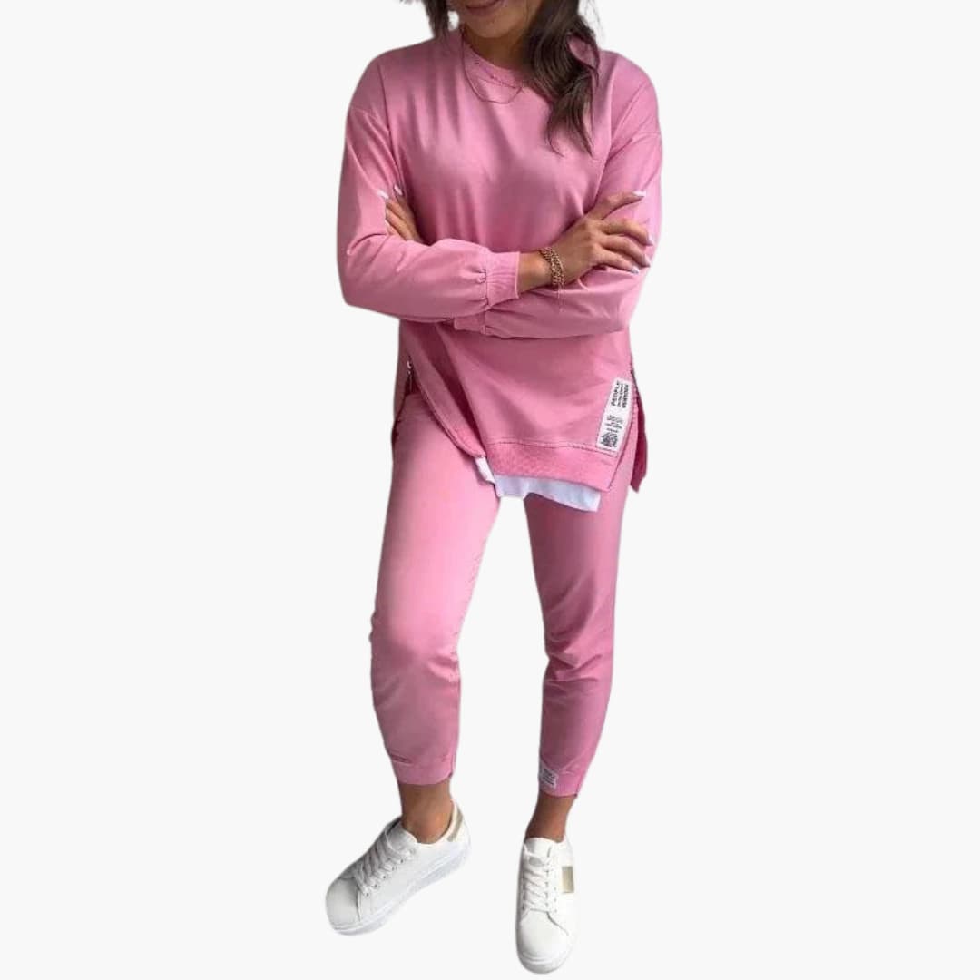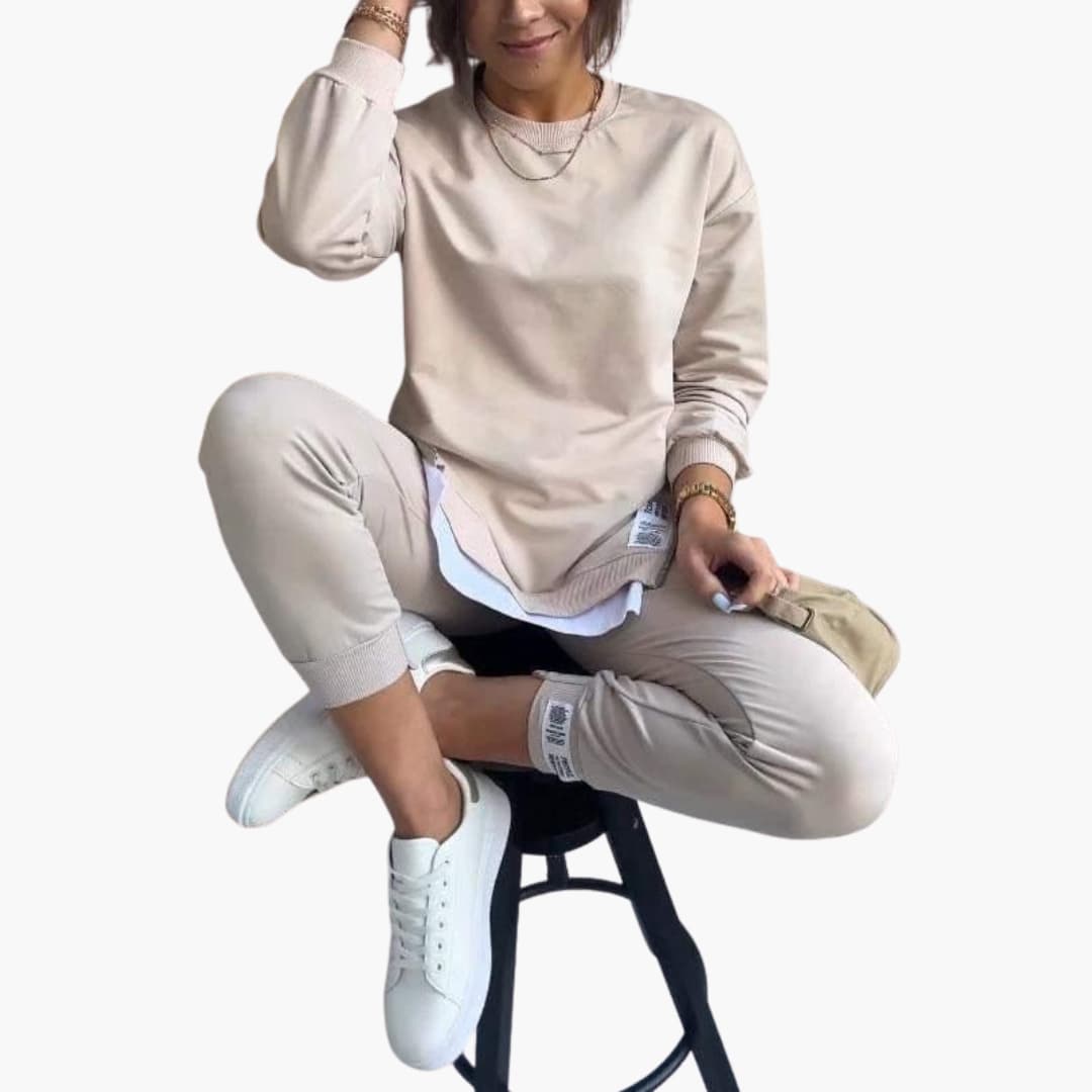 Ten dwuczęściowy zestaw damski zawiera bluzę z długim rękawem oraz pasujące spodnie dresowe. Bluza ma okrągły dekolt, opuszczone ramiona i prążkowane ściągacze, natomiast spodnie posiadają elastyczny pas i zwężane nogawki. Zaprojektowany dla skoordynowanego stylu, każdy element można nosić razem lub osobno. Proste linie i staranne wykończenia utrzymują zrównoważony kształt odpowiedni do codziennego użytku.