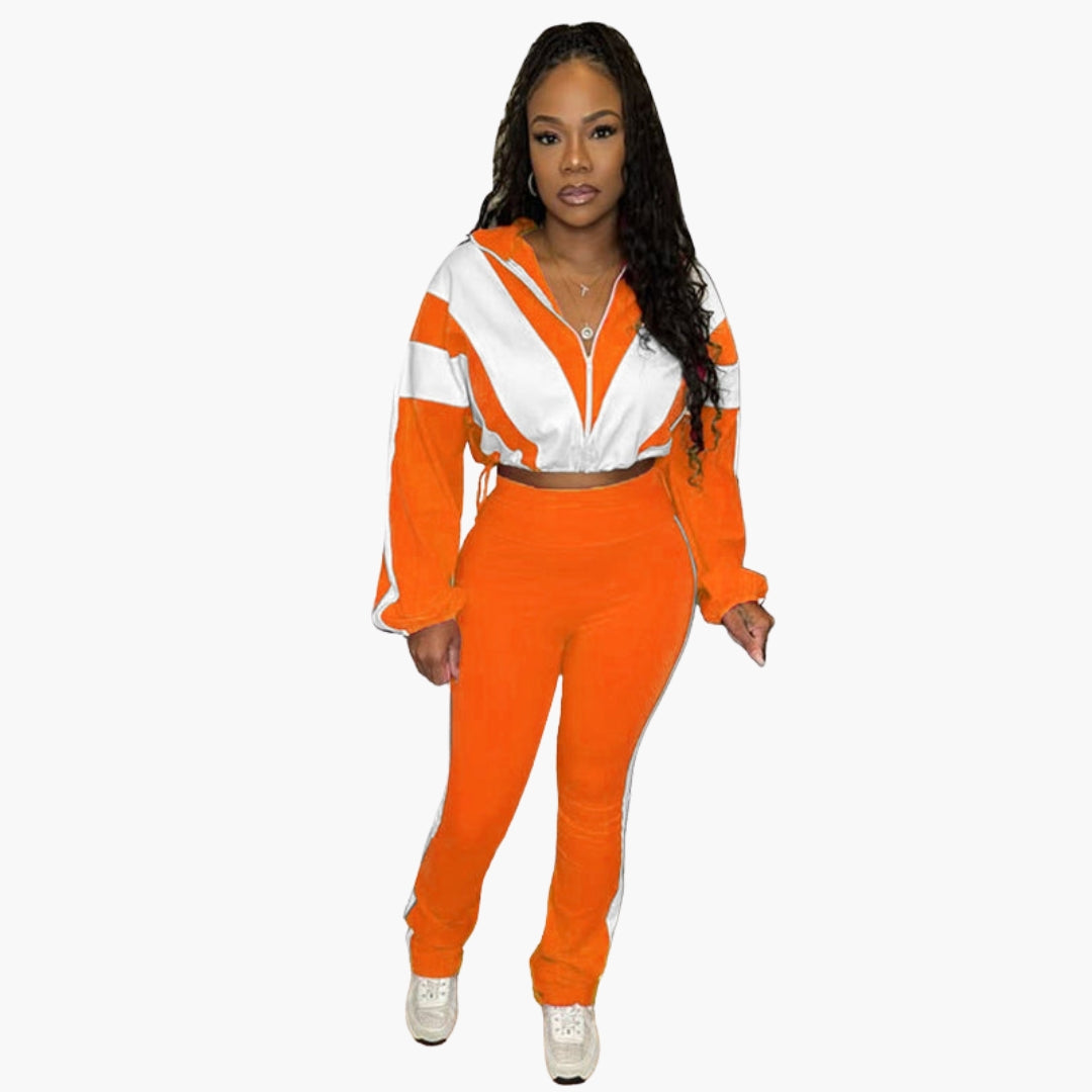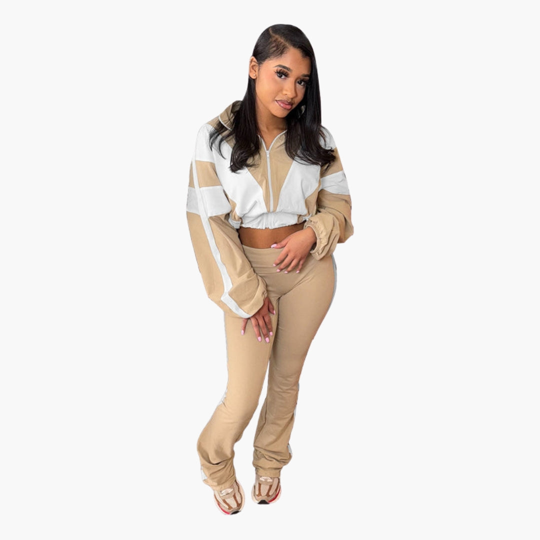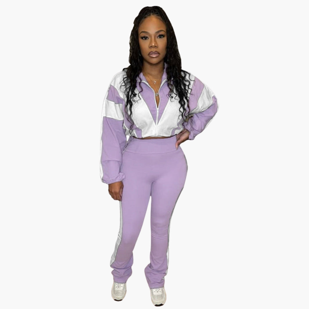Ten dwuczęściowy zestaw damski zawiera kurtkę na zamek z bufiastymi rękawami i krótkim wykończeniem. Spodnie mają elastyczną talię oraz prosty, długi krój z marszczeniem na dole. Oba elementy mają kontrastujące wstawki tworzące efekt patchworku. Powierzchnia jest jednolita, bez widocznej podszewki czy dodatkowych ozdób.