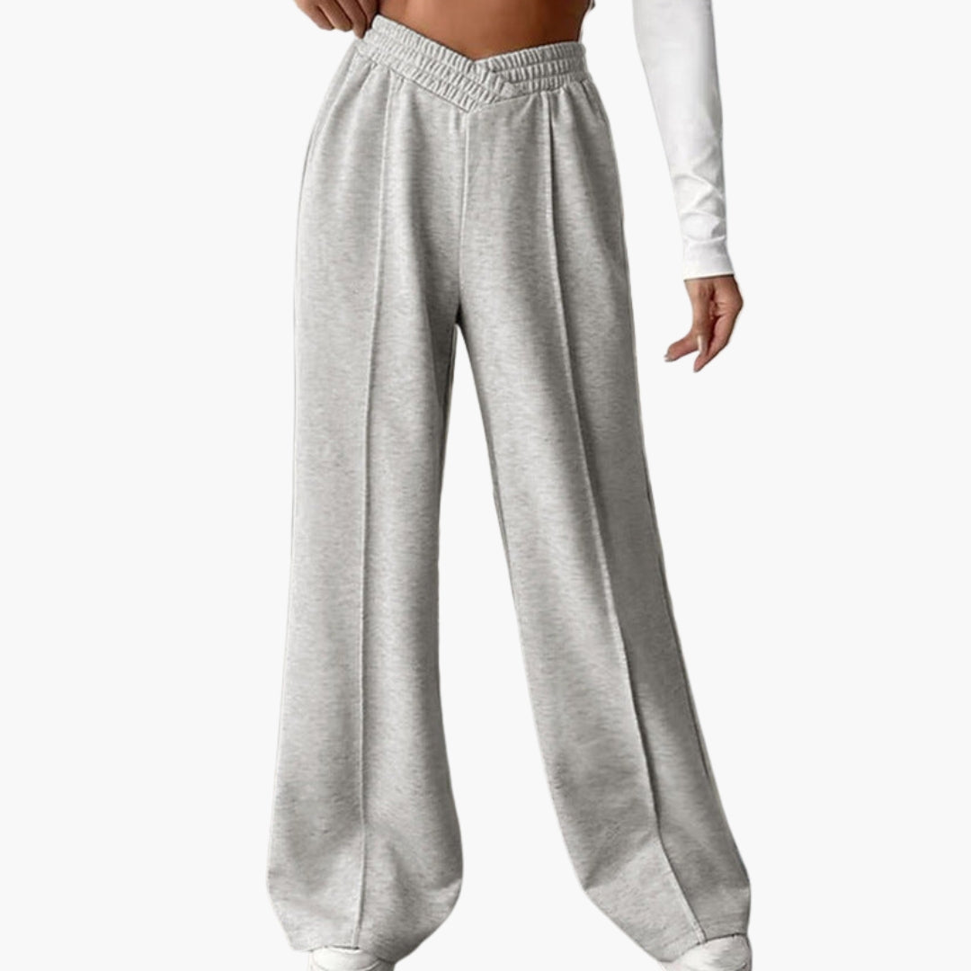 Szerokie damskie spodnie sportowe z elastycznym pasem i długimi prostymi nogawkami.
