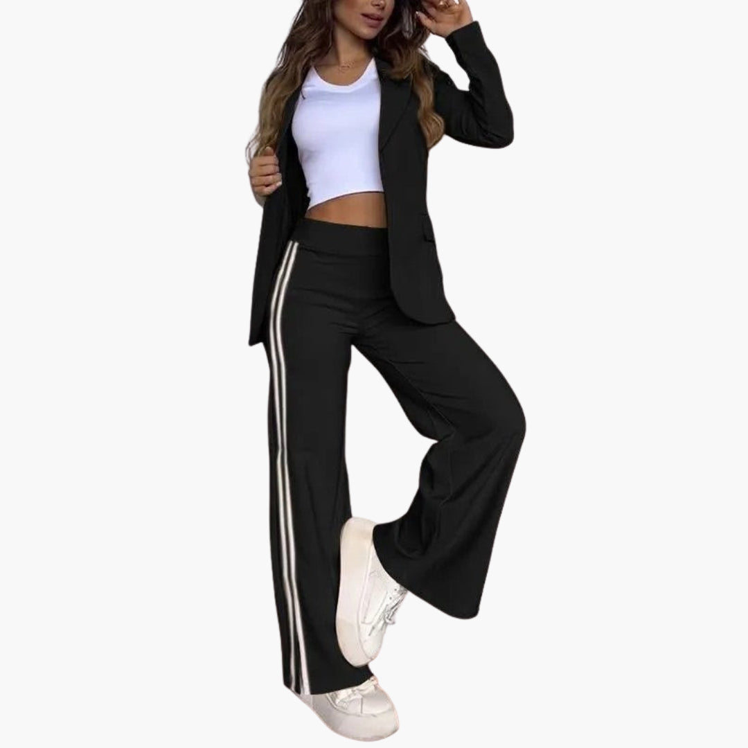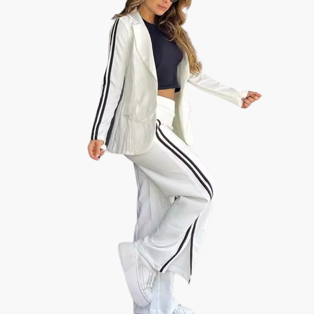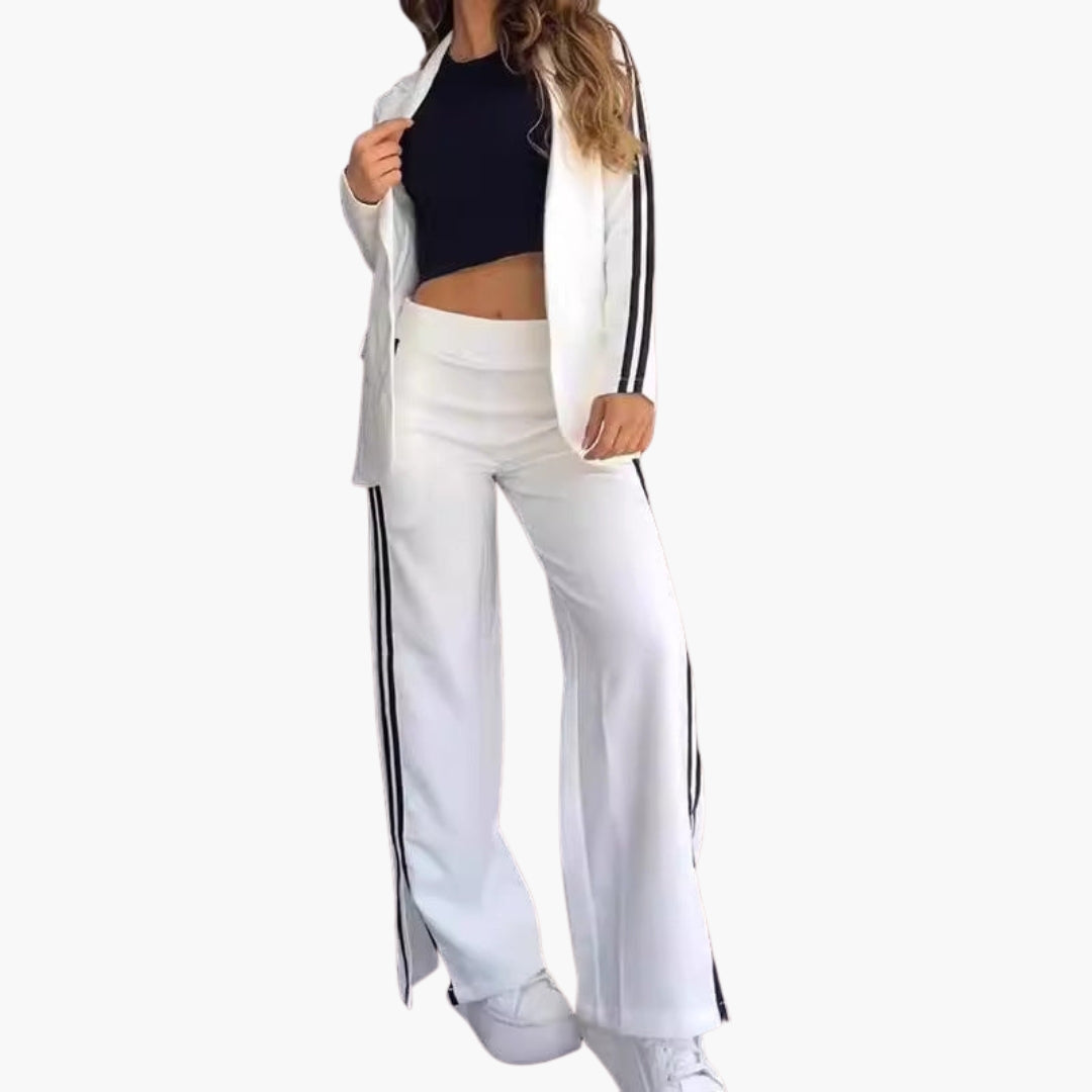 Zestaw zawiera marynarkę z otwartym dekoltem, zapięciem na guziki, przednimi kieszeniami, długimi rękawami oraz prostym dołem wykonaną z gładkiej tkaniny. Spodnie mają elastyczną talię bez widocznego zapięcia, boczne kieszenie, proste i szerokie nogawki oraz wykończone brzegi z pionowymi detalami w paski.