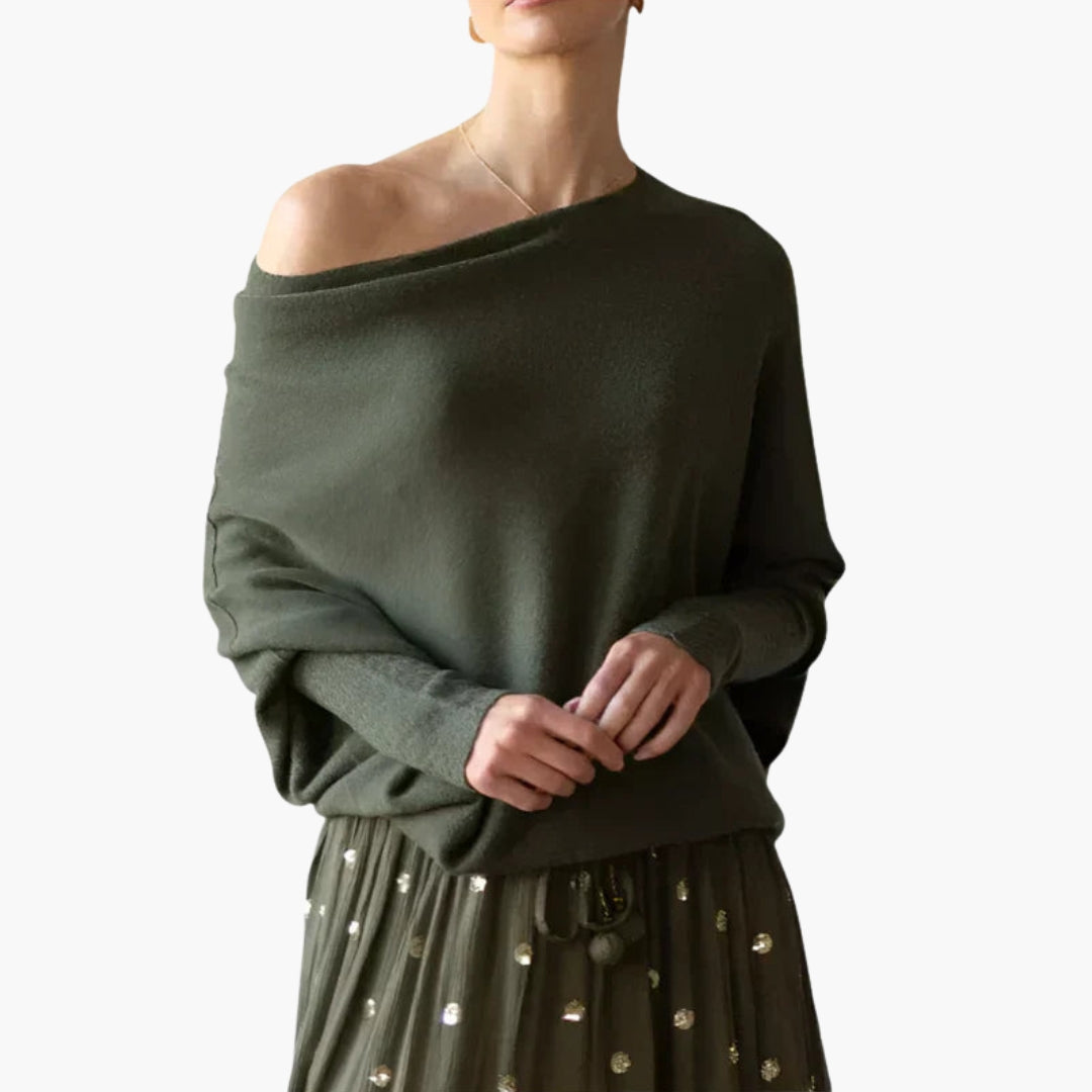 Luźny sweter damski z dekoltem w łódkę i płynnym krojem.