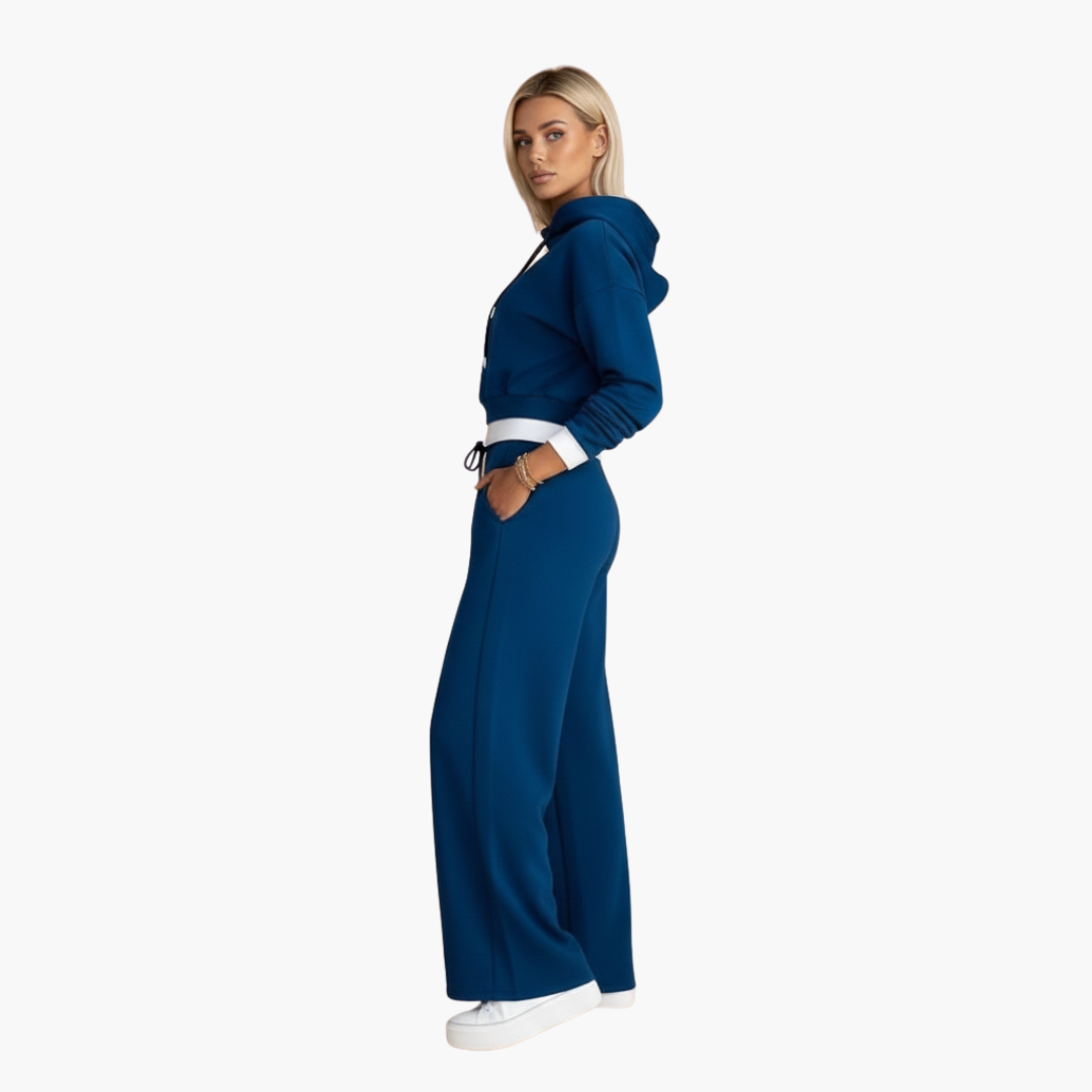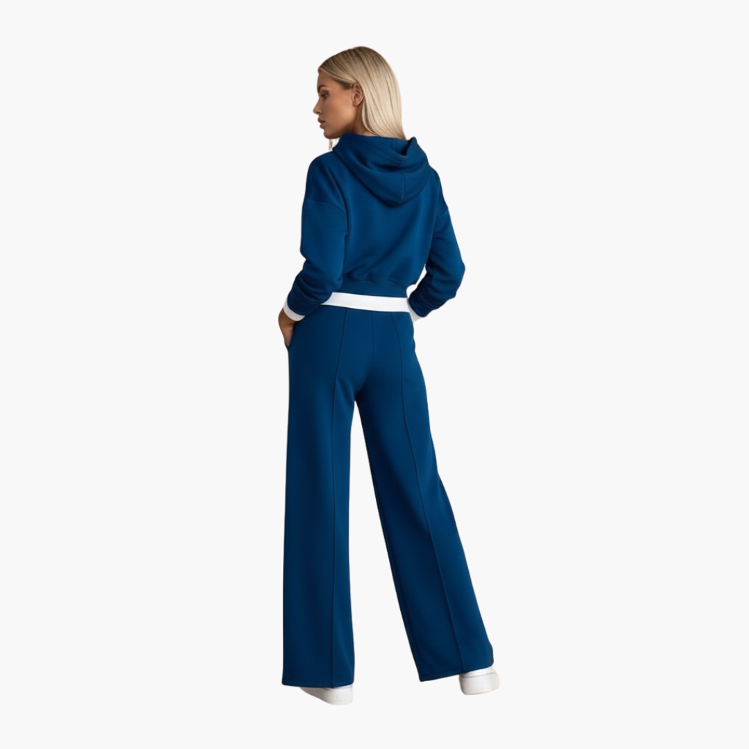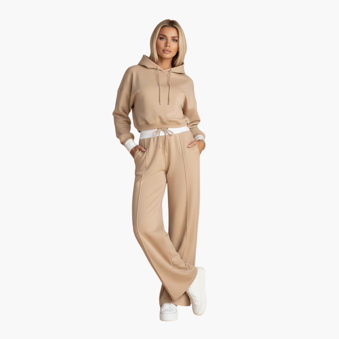 Ten damski zestaw zawiera krótką bluzę z troczkiem oraz gładką, tkaną górę, w połączeniu ze spodniami z elastycznym pasem, kieszeniami bocznymi i szerokimi nogawkami. Obie części mają kontrastowe wykończenia i gładką powierzchnię, zaprojektowane tak, aby stworzyć spójny wygląd.