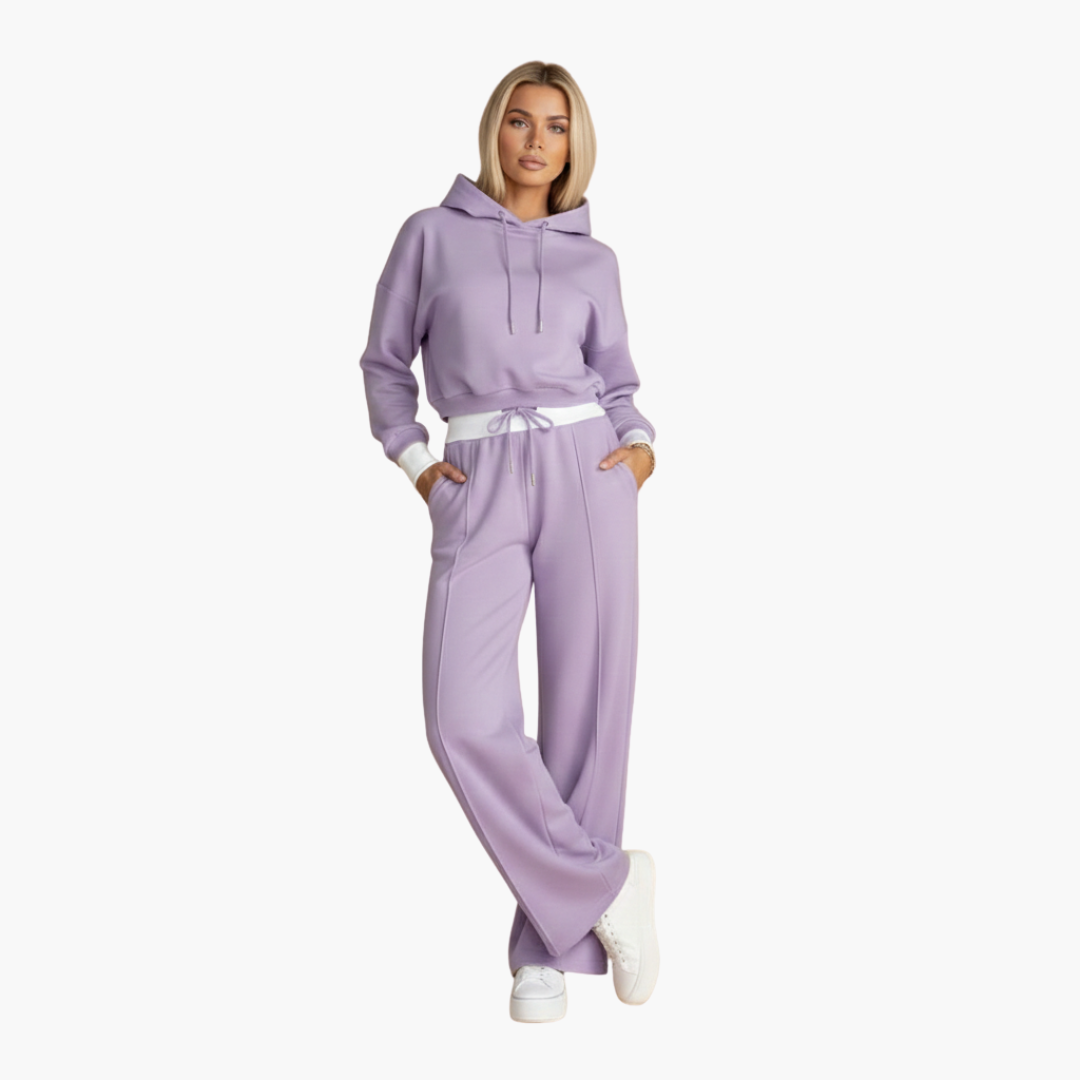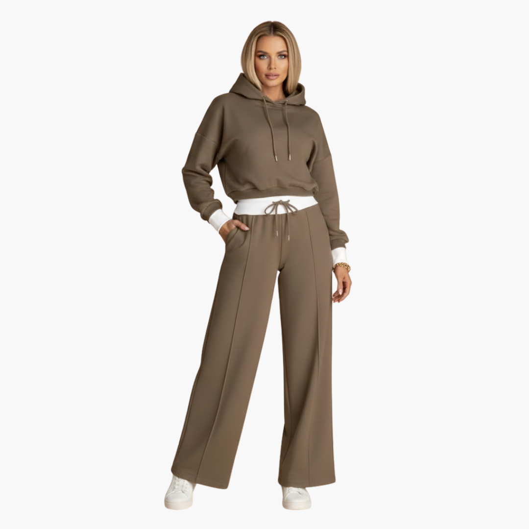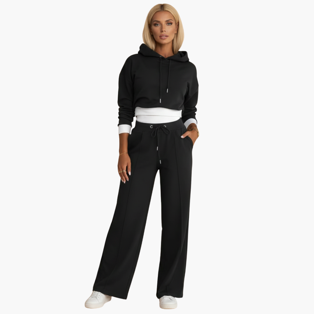 Ten damski zestaw zawiera krótką bluzę z troczkiem oraz gładką, tkaną górę, w połączeniu ze spodniami z elastycznym pasem, kieszeniami bocznymi i szerokimi nogawkami. Obie części mają kontrastowe wykończenia i gładką powierzchnię, zaprojektowane tak, aby stworzyć spójny wygląd.