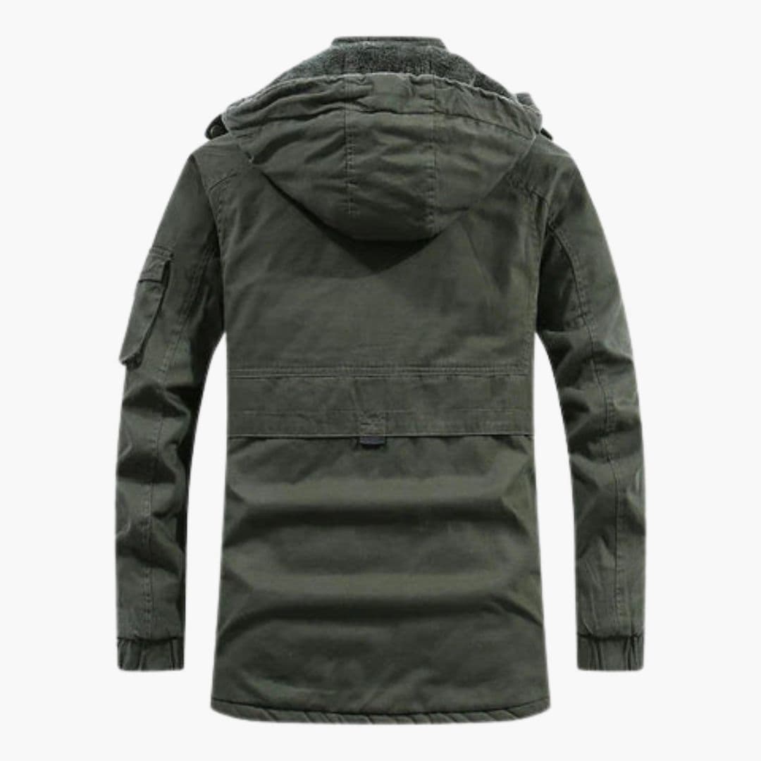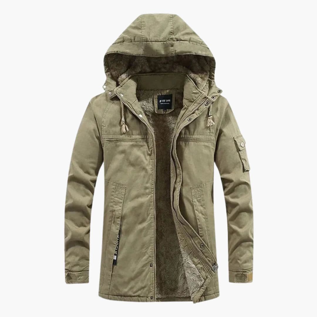 This men's jacket features a removable hood with drawstring, a full-length zipper closure, long sleeves with straight cuffs, a thick fleece lining, and several pockets. The exterior has a solid woven surface, providing suitable protection against cold and layering outfits.