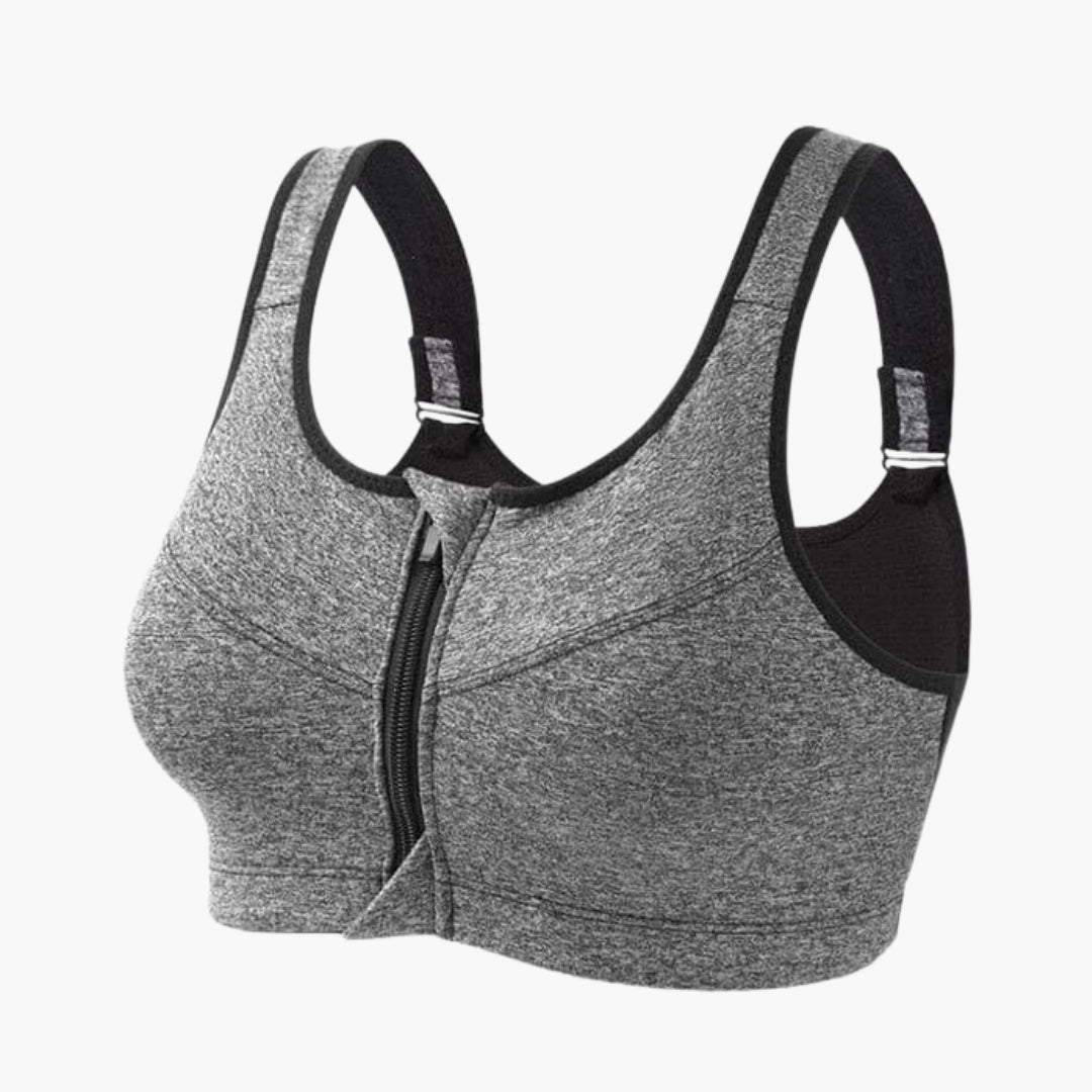 This plus size women's sports bra features a rounded neckline and a front zipper. The wide straps are adjustable, and the underbust band provides support. The cups are integrated, and the mesh surface promotes ventilation. The elastic base completes the model's structure.