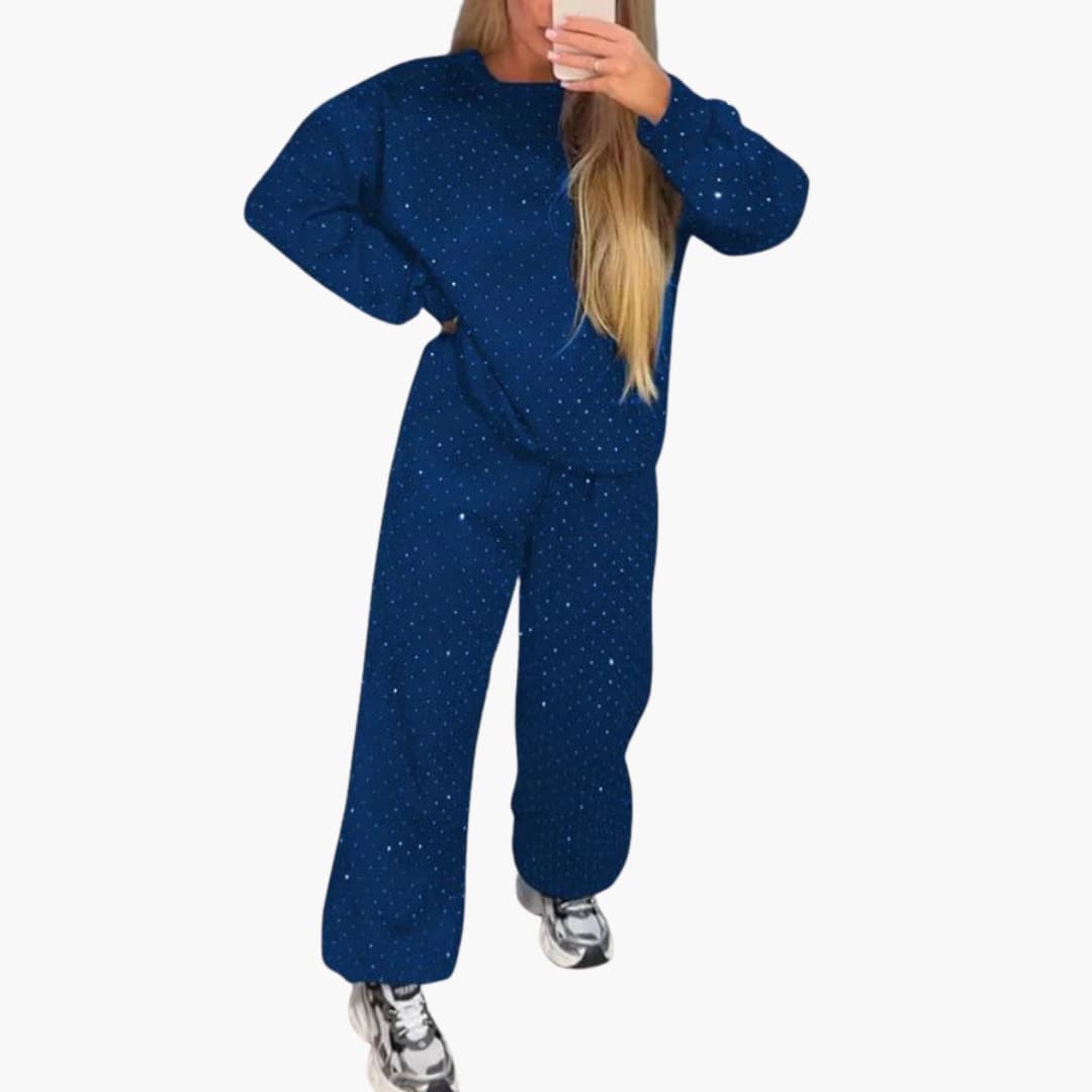 This two-piece set includes a top with a round neckline, drop shoulders, and a solid outer surface. The matching bottom has an elastic waist, straight legs, and a defined hem. Glitter accents appear on the upper part, creating a subtle visual effect throughout the coordinated ensemble.