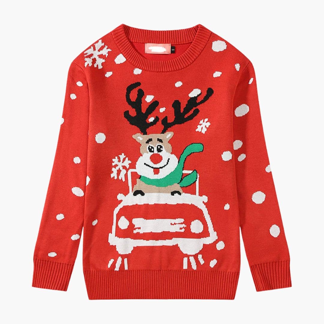 Women's Christmas sweater featuring a reindeer pattern and ribbed finishes.