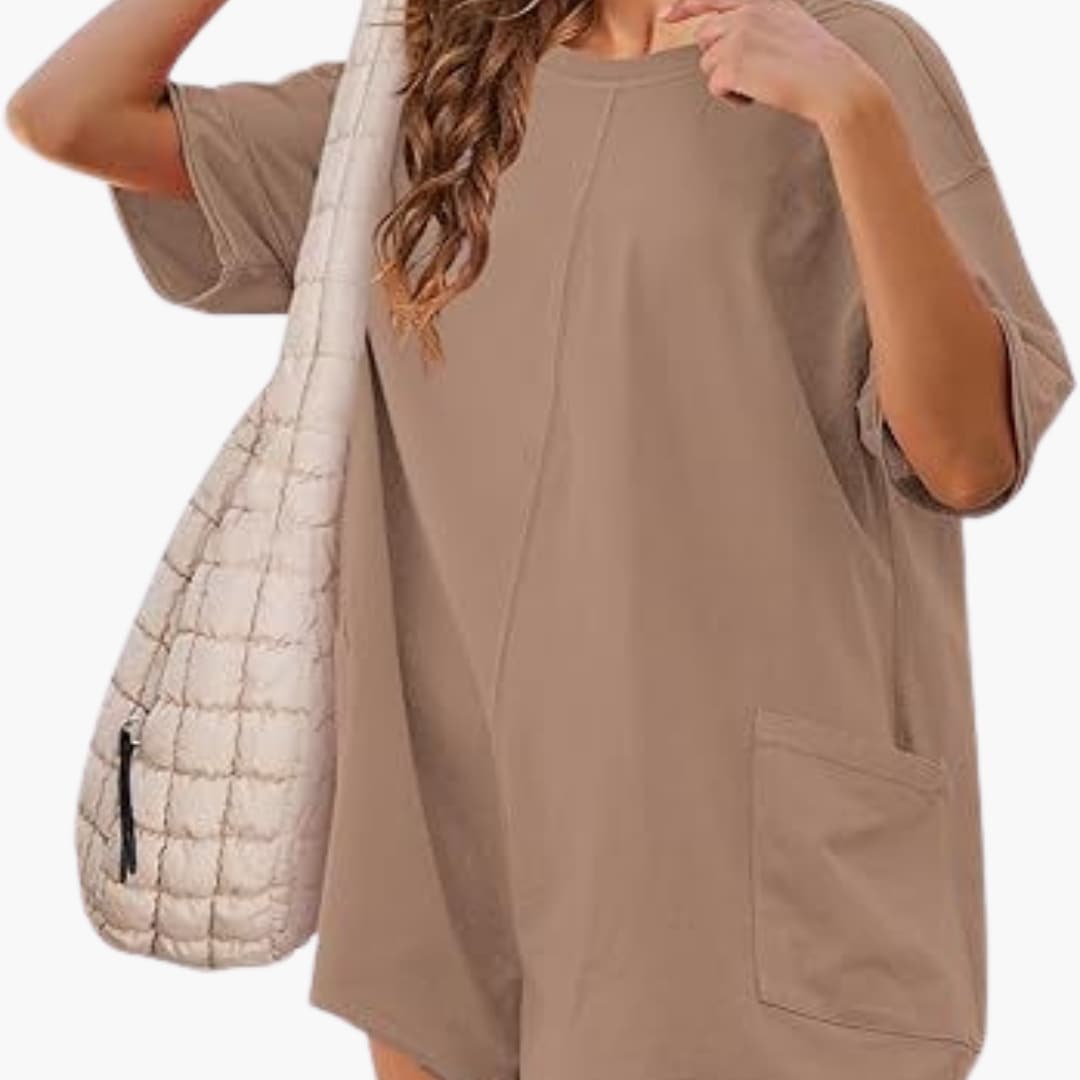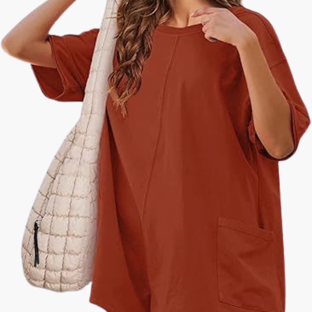 This women's t-shirt dress features a round neckline with a slip-on design. The short sleeves come from slightly dropped shoulders and blend into a loose fit throughout the garment. Side pockets are integrated along the seams, adding a discreet functional element.