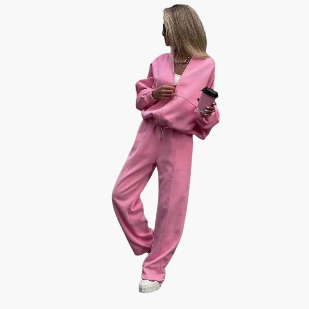 This women's short sports set includes a loose top with a front zipper closure, long sleeves, and a straight hem. The matching pants feature an elastic waistband with a drawstring and side pockets. Both pieces have a solid color and a straight cut, designed to be worn during various daily activities.