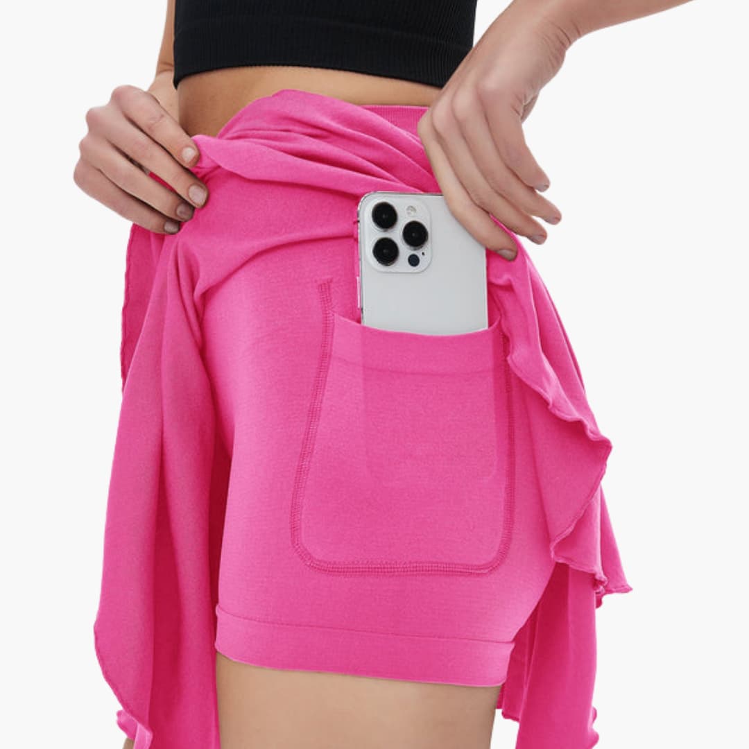 These women's shorts feature an elastic waistband with no buttons or zipper closure. They include two integrated side pockets, positioned on either side. The cut is short and follows a straight line to the hem, which ends straight. The exterior has a solid color, with visible seams evenly distributed throughout the garment.