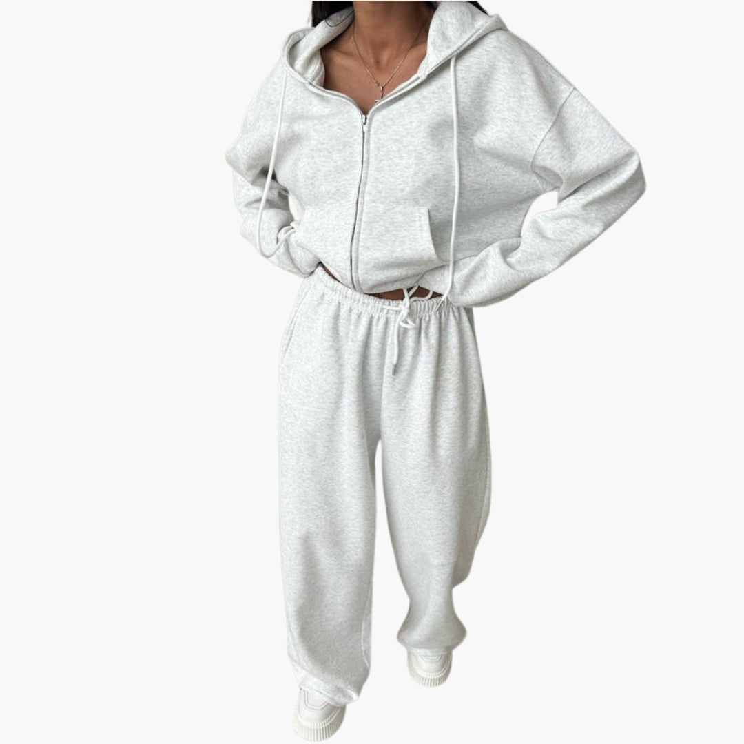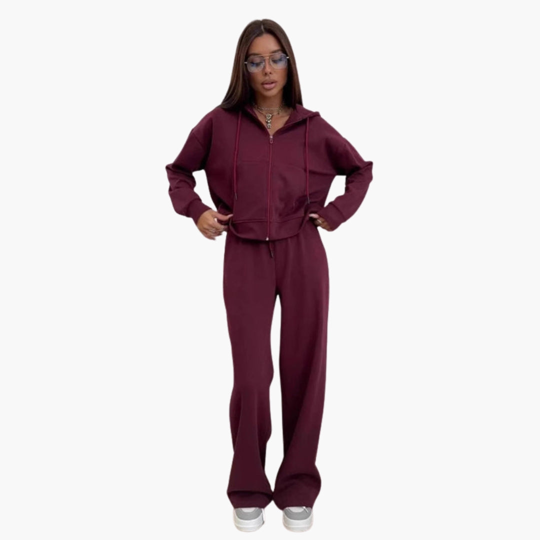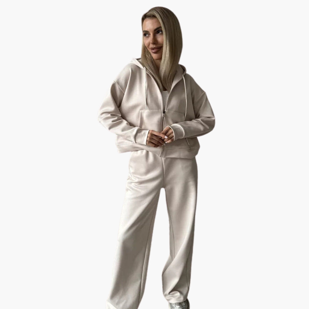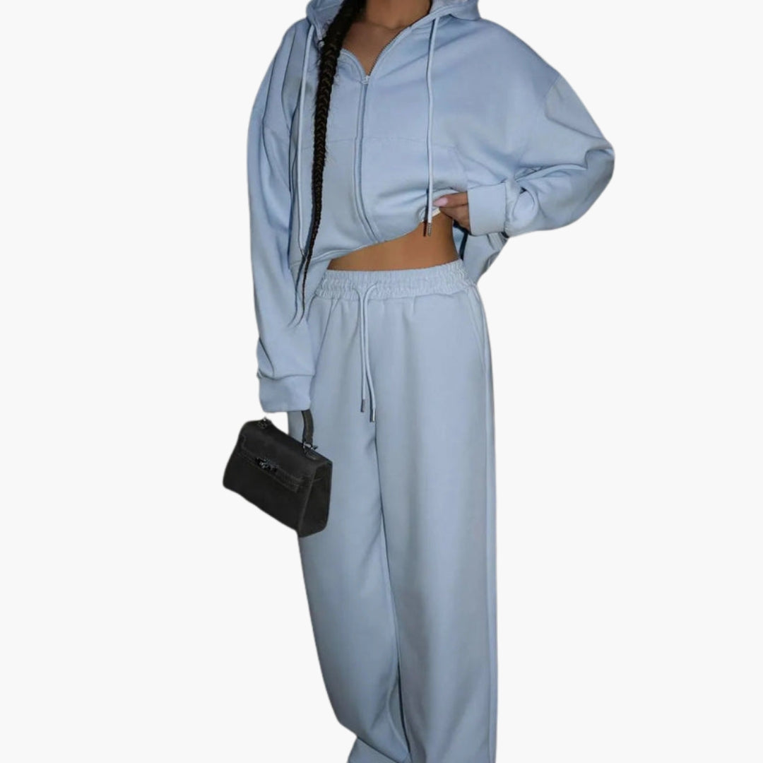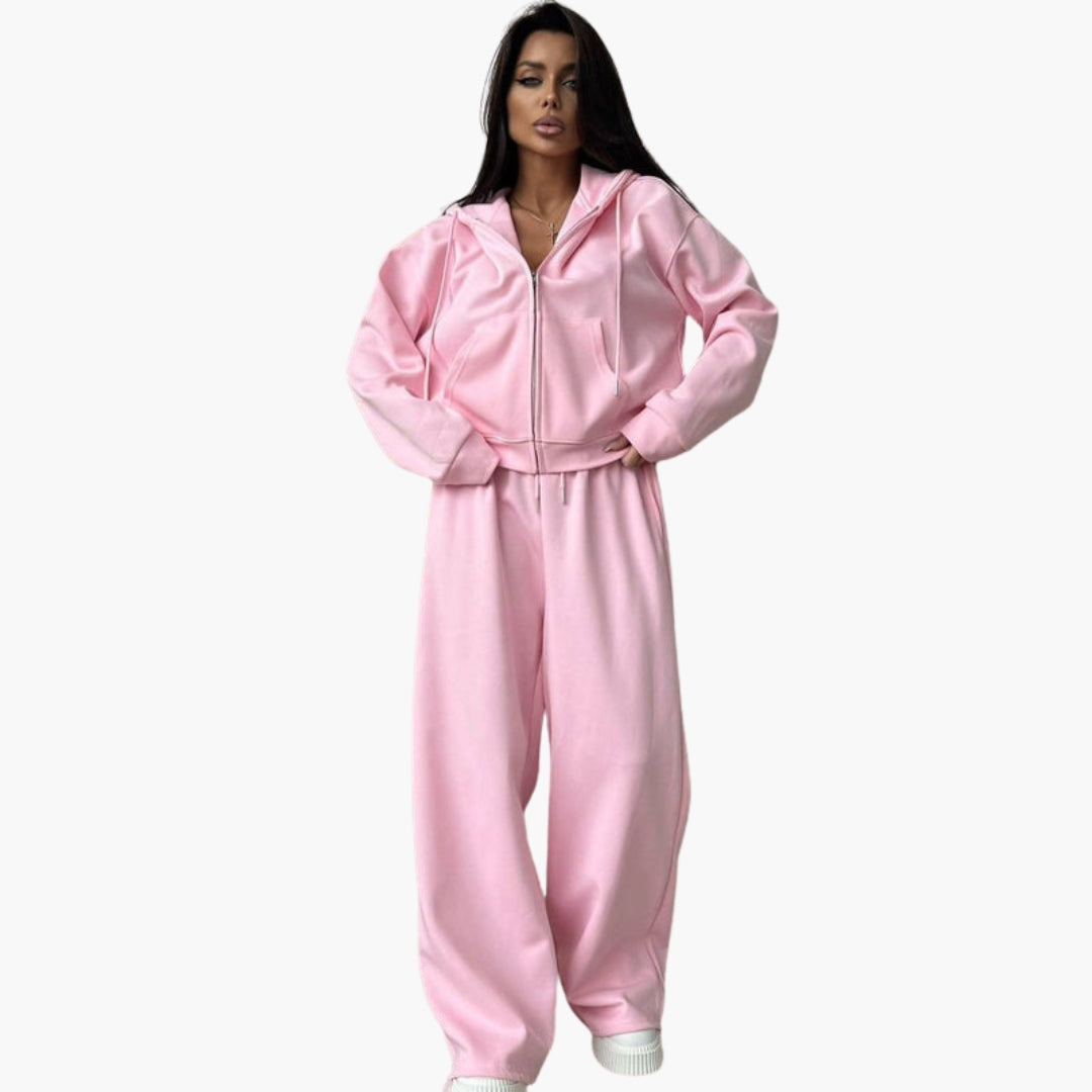 Sports set with hooded jacket and wide pants.