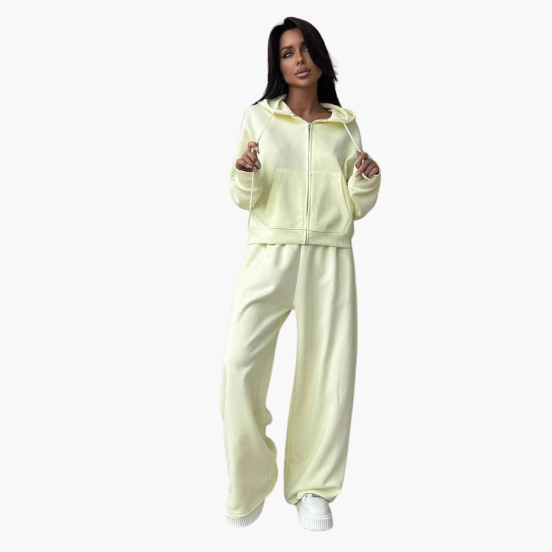This women's sports set includes a hooded jacket with a full-length zipper, drawstring hood, and kangaroo pockets at the front. The wide pants feature an elastic waistband and a straight hem. Both pieces showcase a solid surface, designed for everyday wear and moderate-intensity activities.