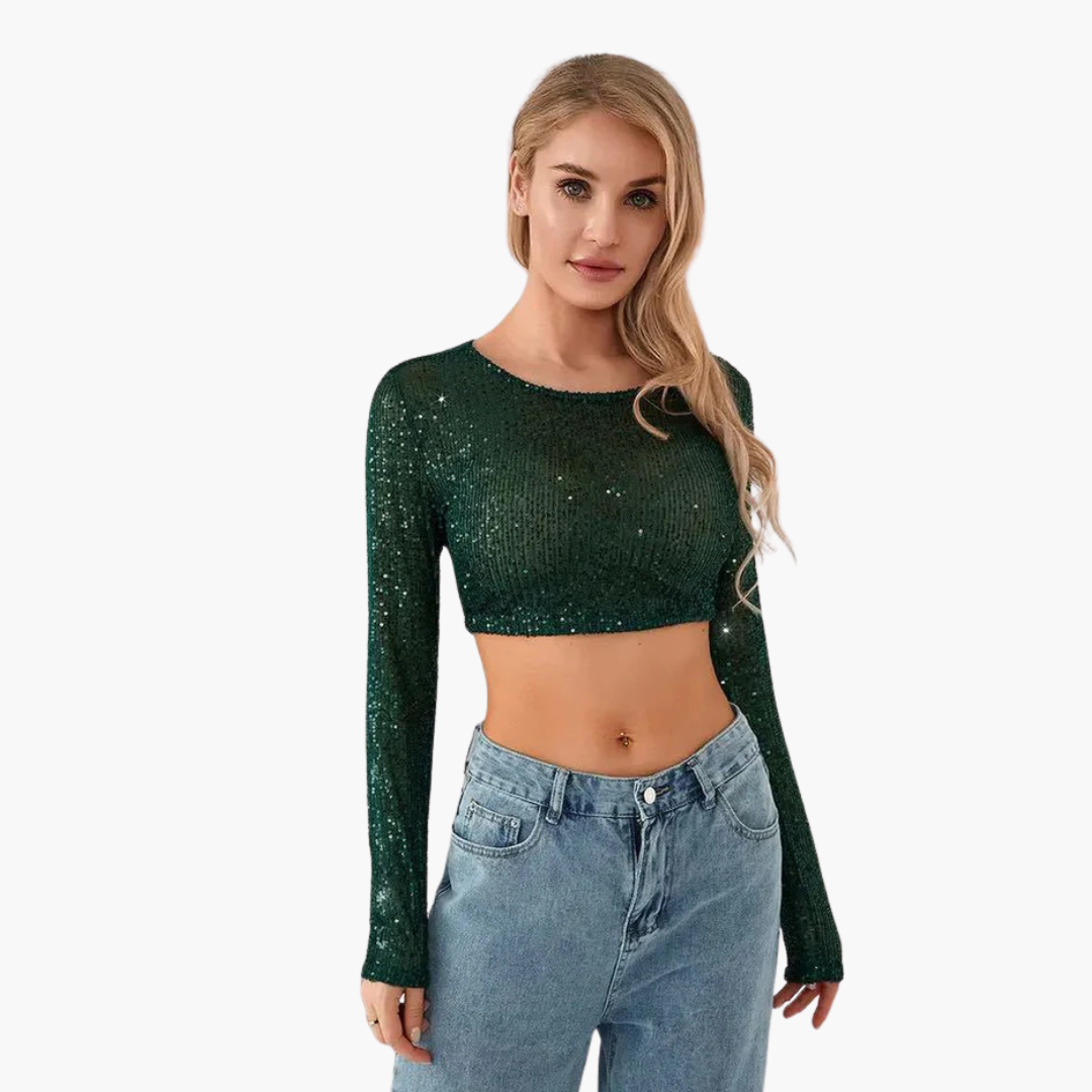 Top de Manga Comprida Feminino com Lantejoulas e Decote Redondo
