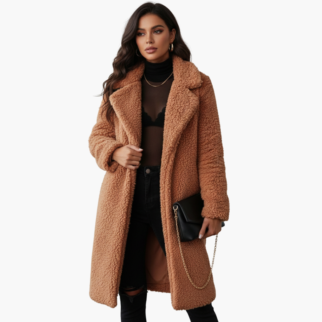 Casaco comprido texturizado para mulher com lapelas largas e abertura frontal.