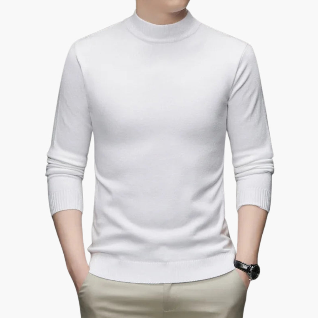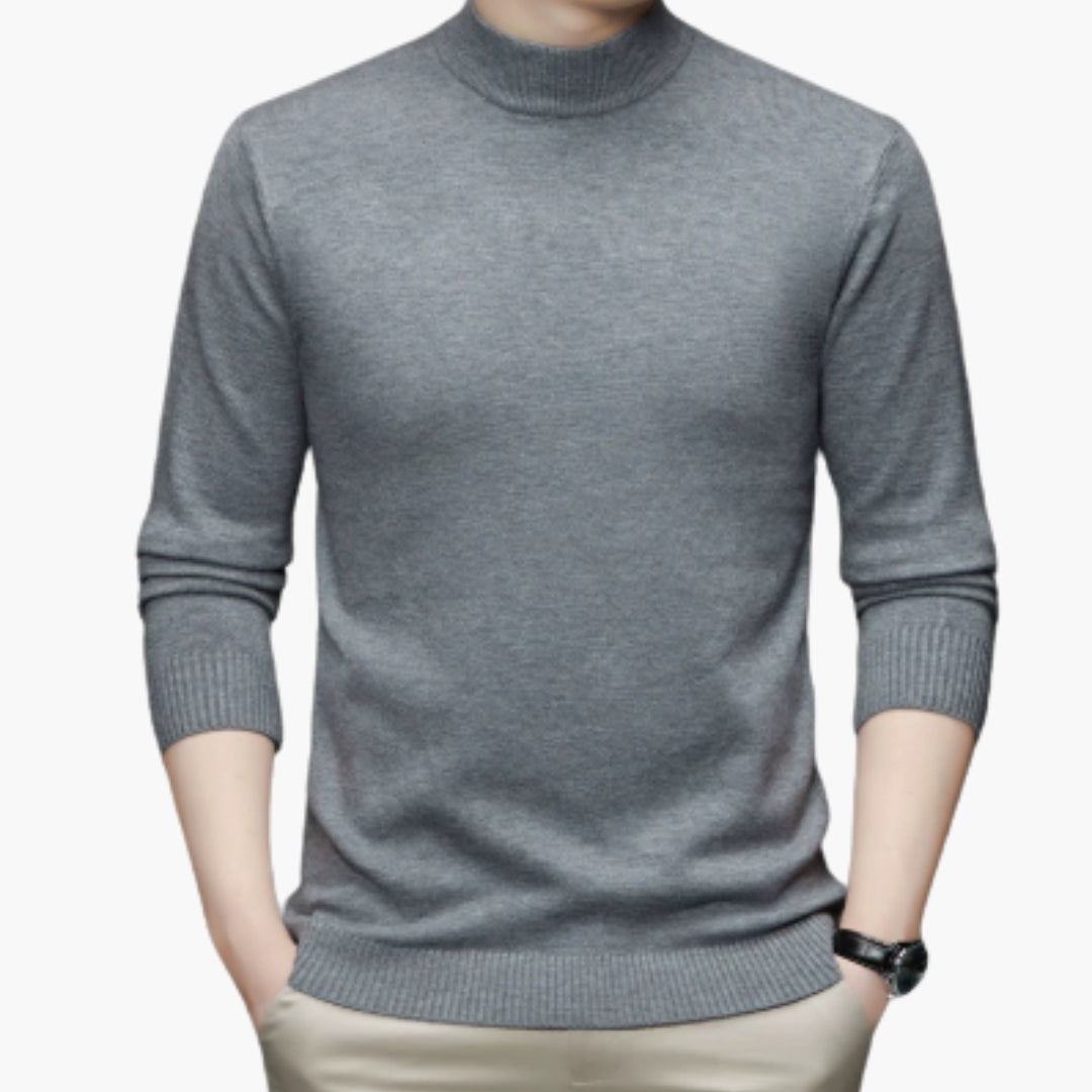 Esta camisola de homem apresenta gola alta, mangas compridas e malha sólida. Os punhos e a bainha têm acabamento com bordas caneladas que estruturam as extremidades. O corte recto segue a linha do tronco. Este modelo pode ser usado com calças ou outras peças, permitindo diferentes estilos.
