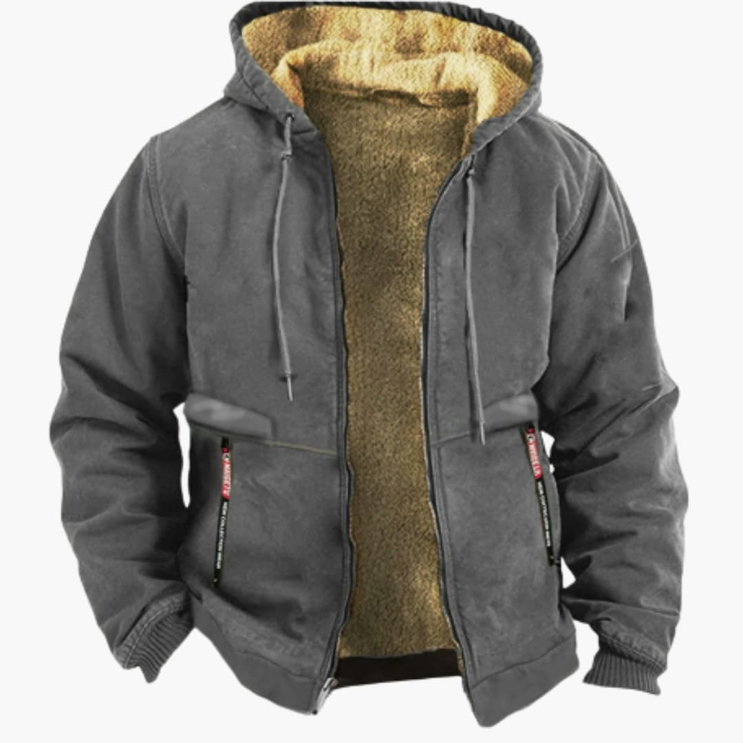 Casaco com capuz para homem com fecho de correr, interior forrado e mangas compridas.