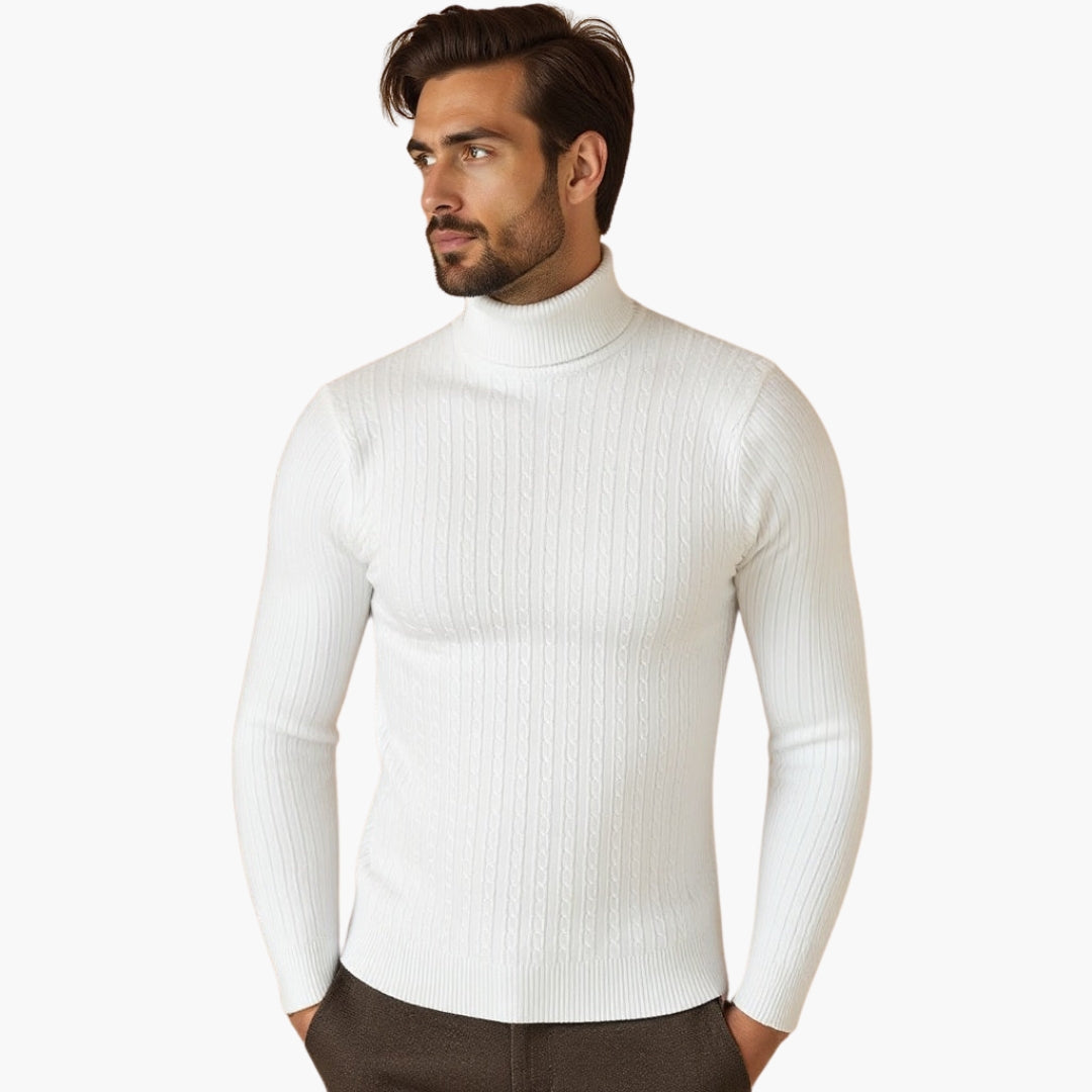 Camisola de gola alta para homem em malha torcida com acabamentos canelados.