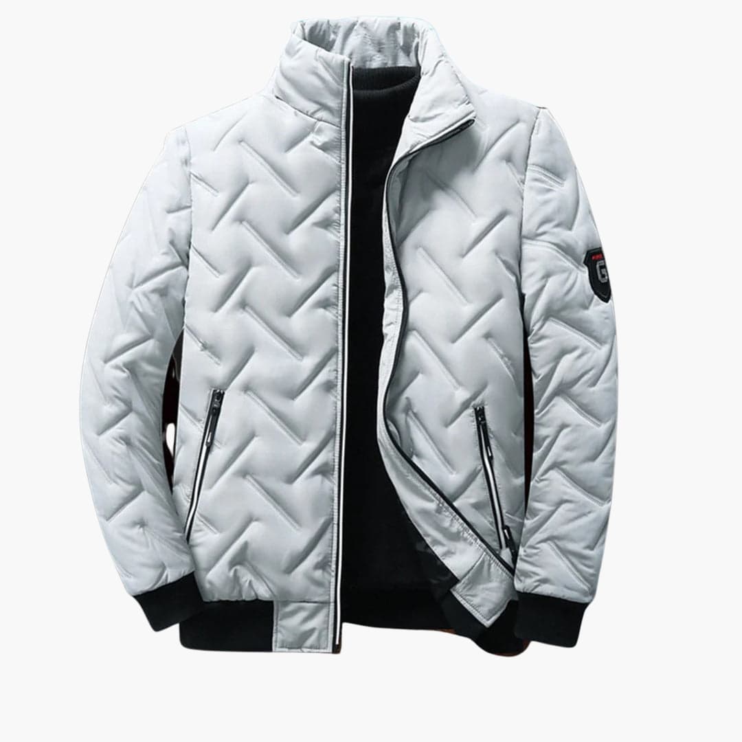 Casaco masculino matelassê com fecho de correr, colarinho alto e bainha canelada.