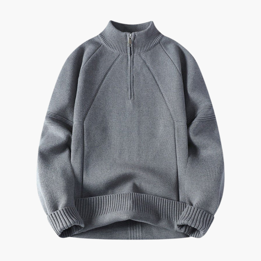 Suéter masculino com fecho de correr e gola alta com superfície estruturada.