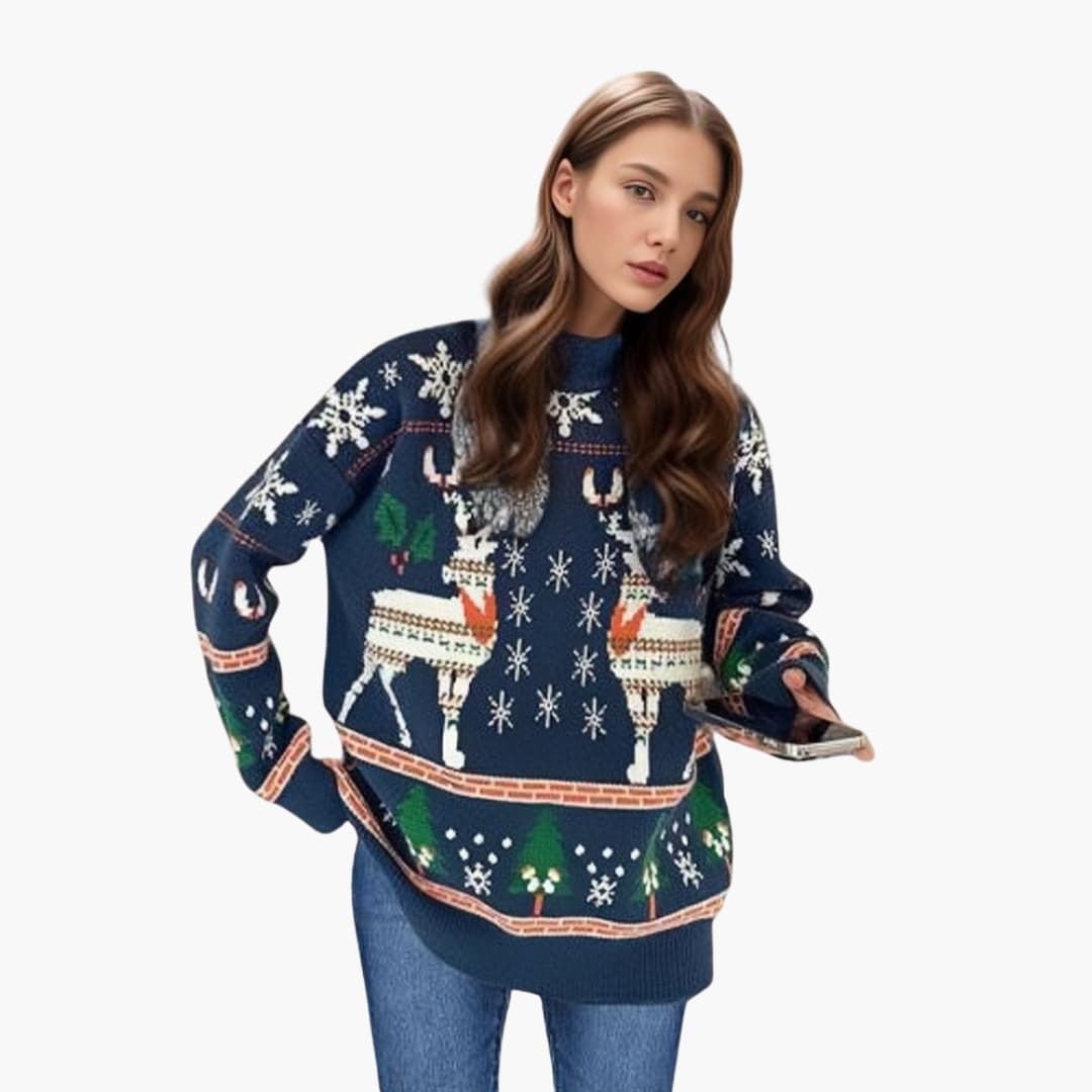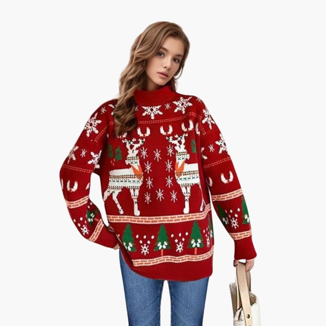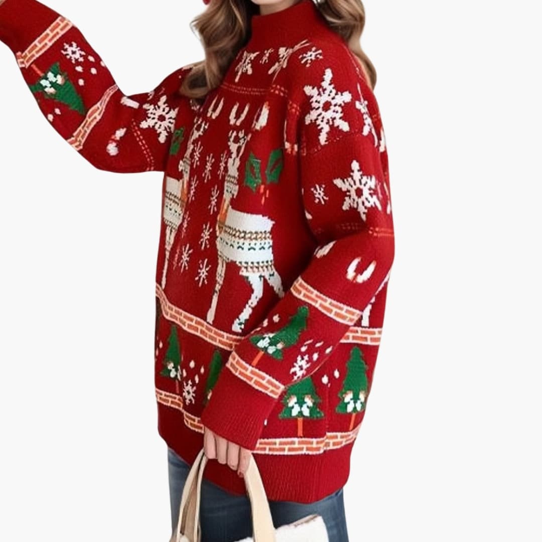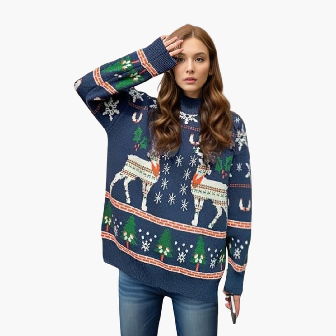 Camisola feminina com padrão de rena e árvore, gola alta.