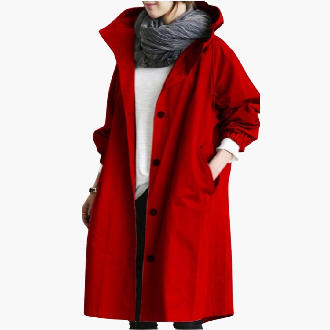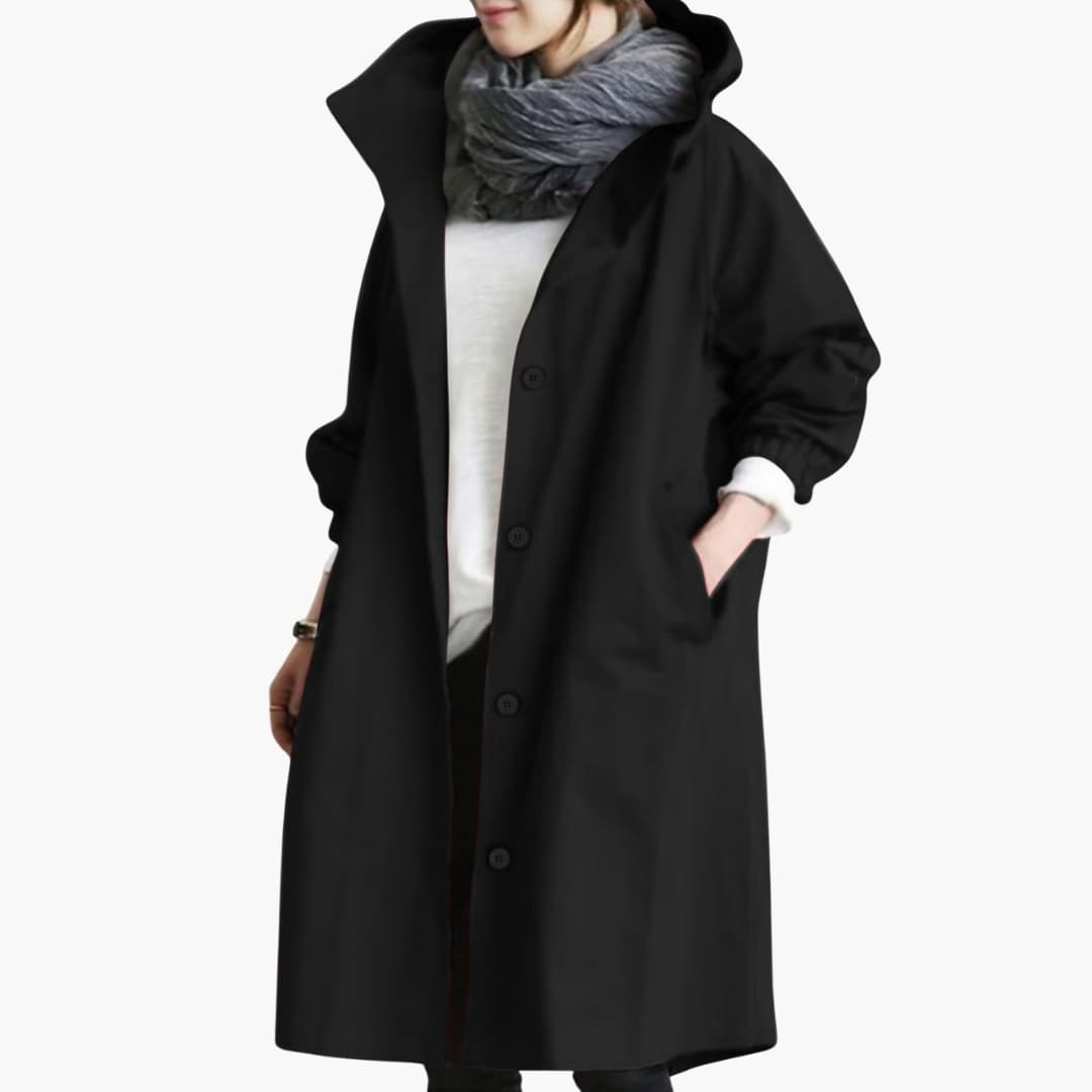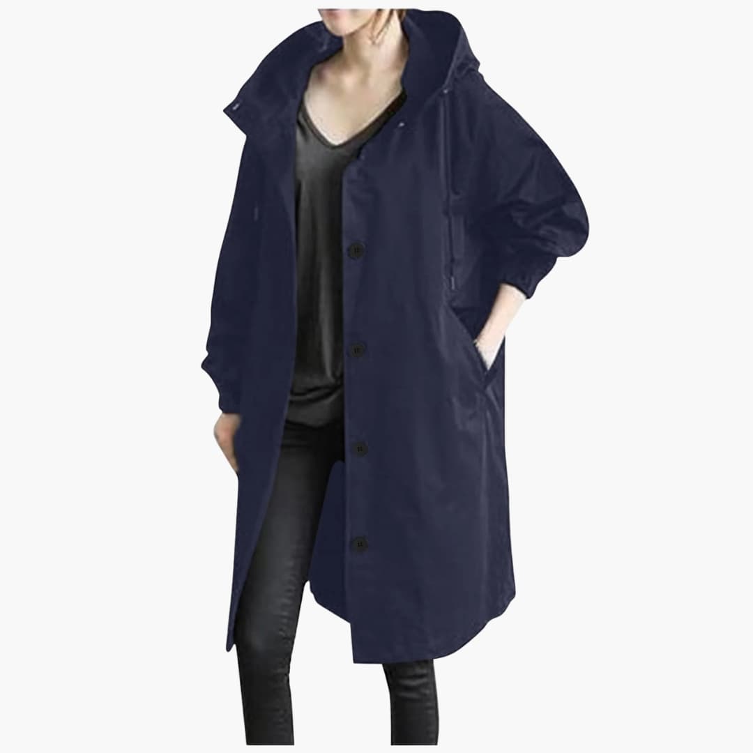 Este casaco trench feminino apresenta uma gola clássica com capuz integrado, fecho frontal com botões e dois bolsos laterais. As mangas compridas têm punhos elásticos para um ajuste confortável. A bainha reta e o exterior tecido sólido realçam o corte estruturado, adequado para sobreposição durante a estação.
