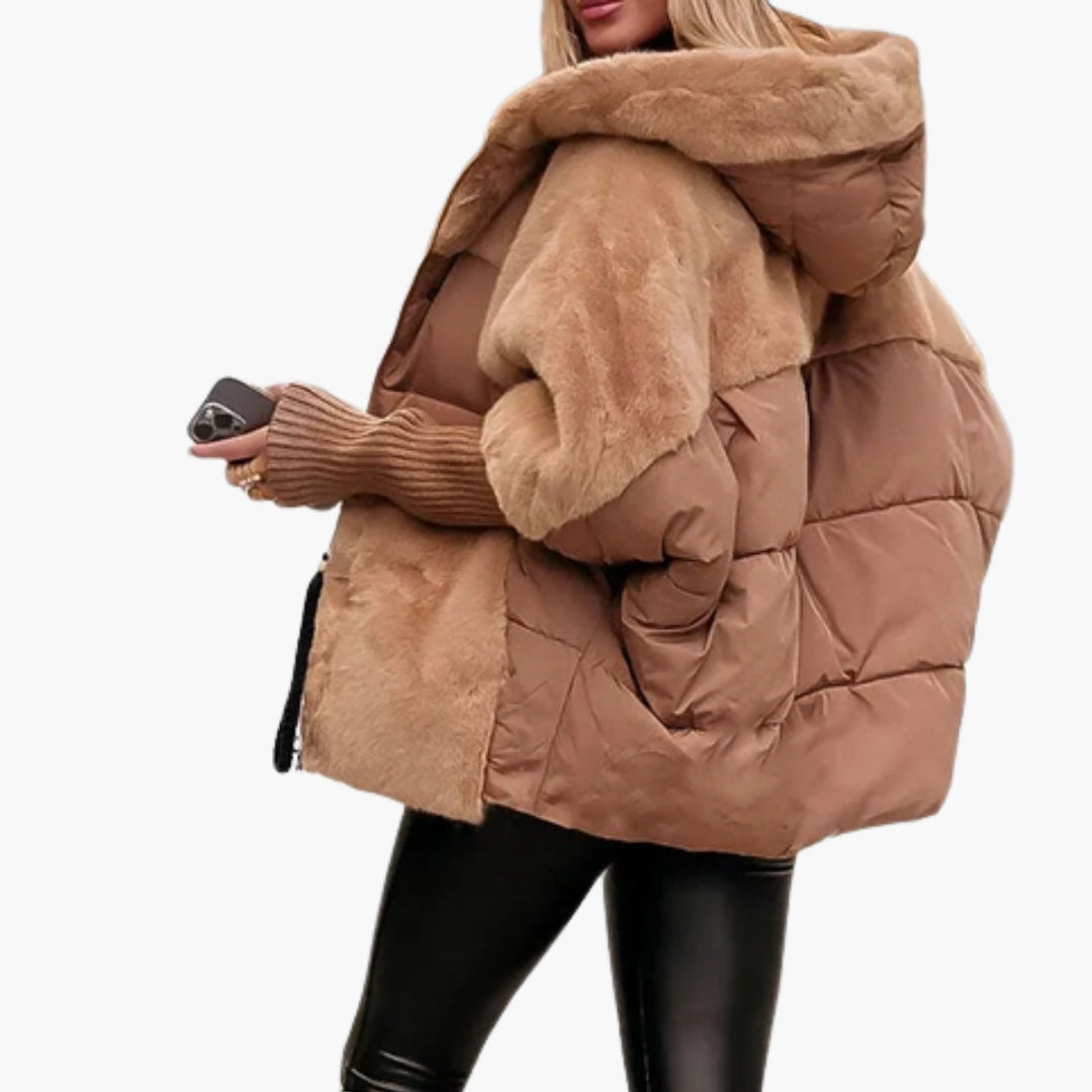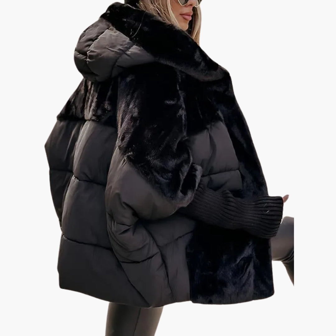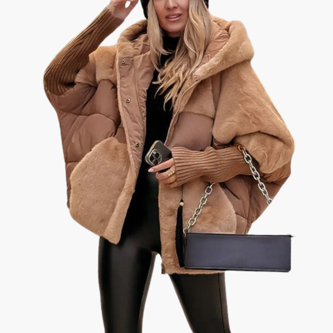 Casaco de inverno com capuz para mulher, pelo sintético, secções acolchoadas, ajuste largo.