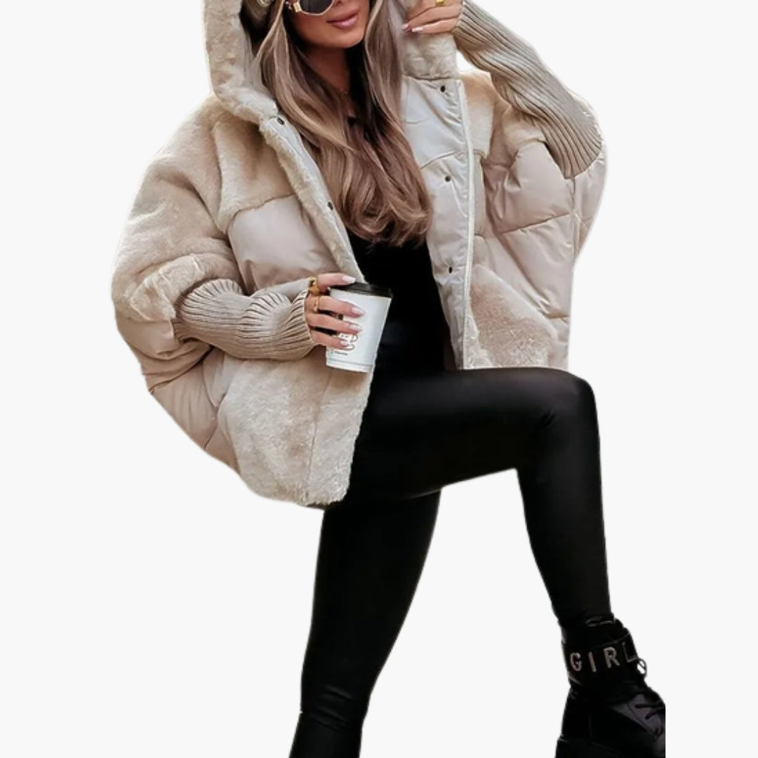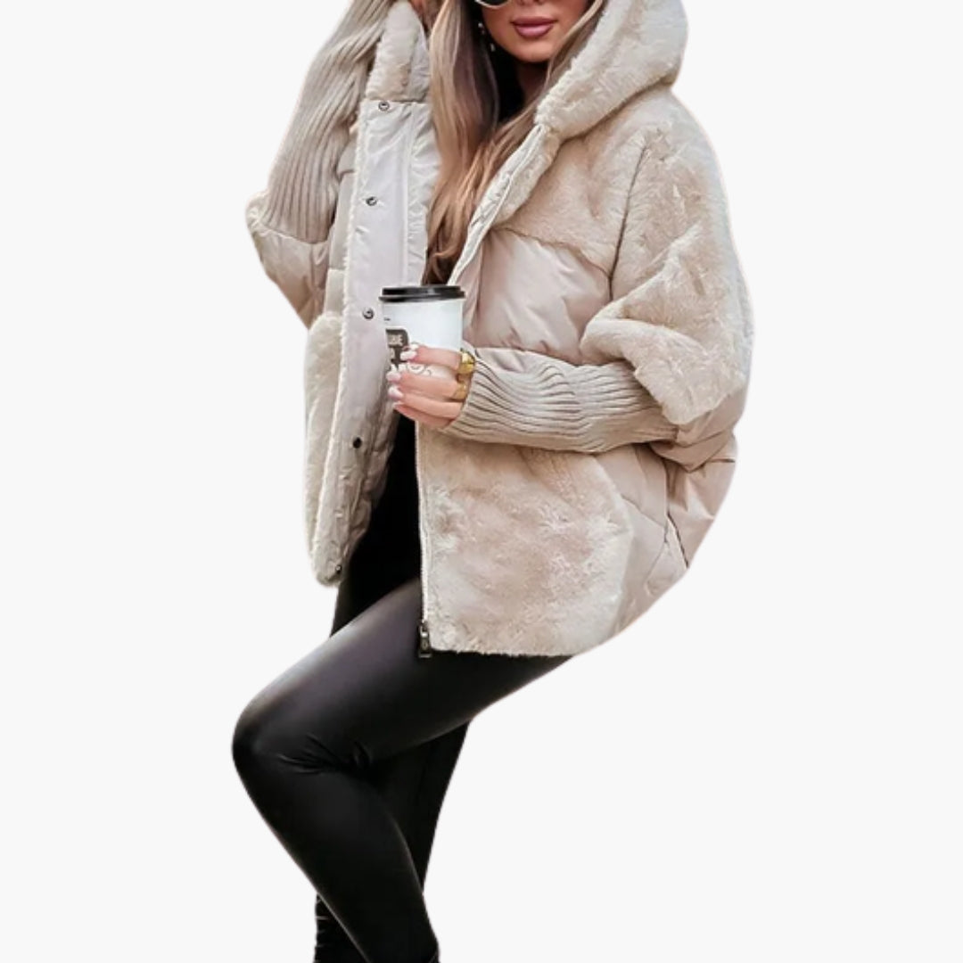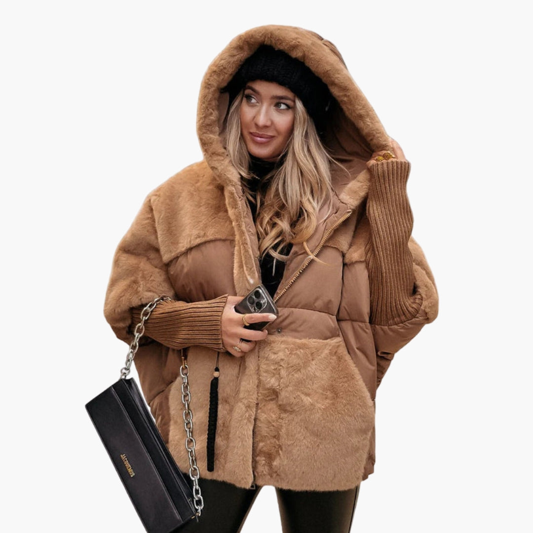 Casaco de inverno com capuz para mulher, pelo sintético, secções acolchoadas, ajuste largo.