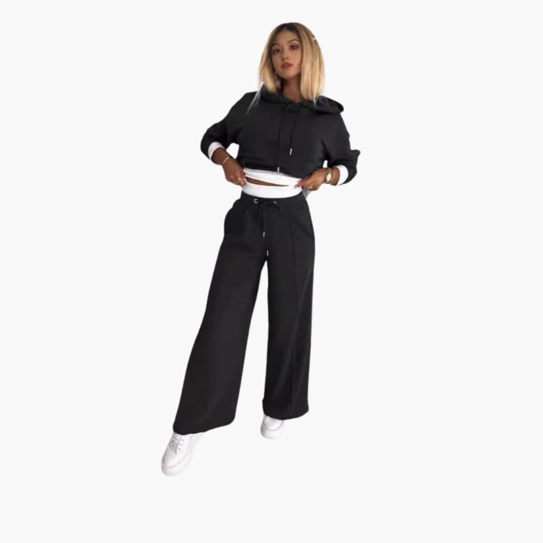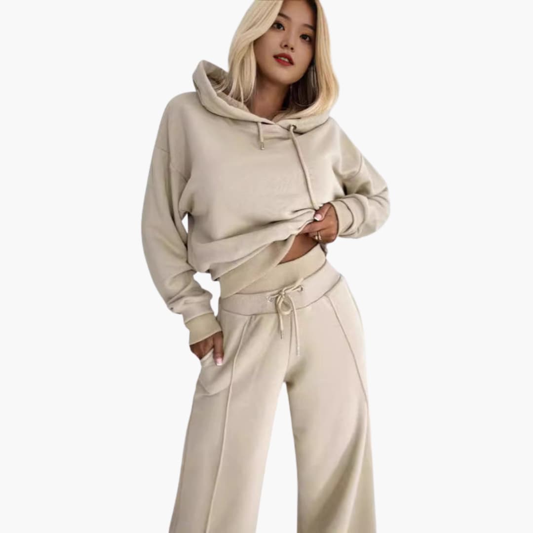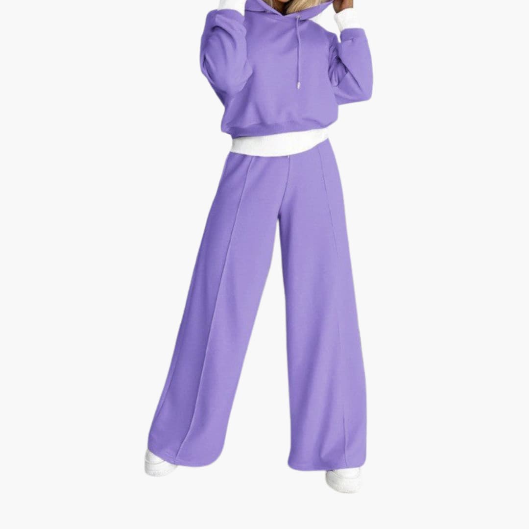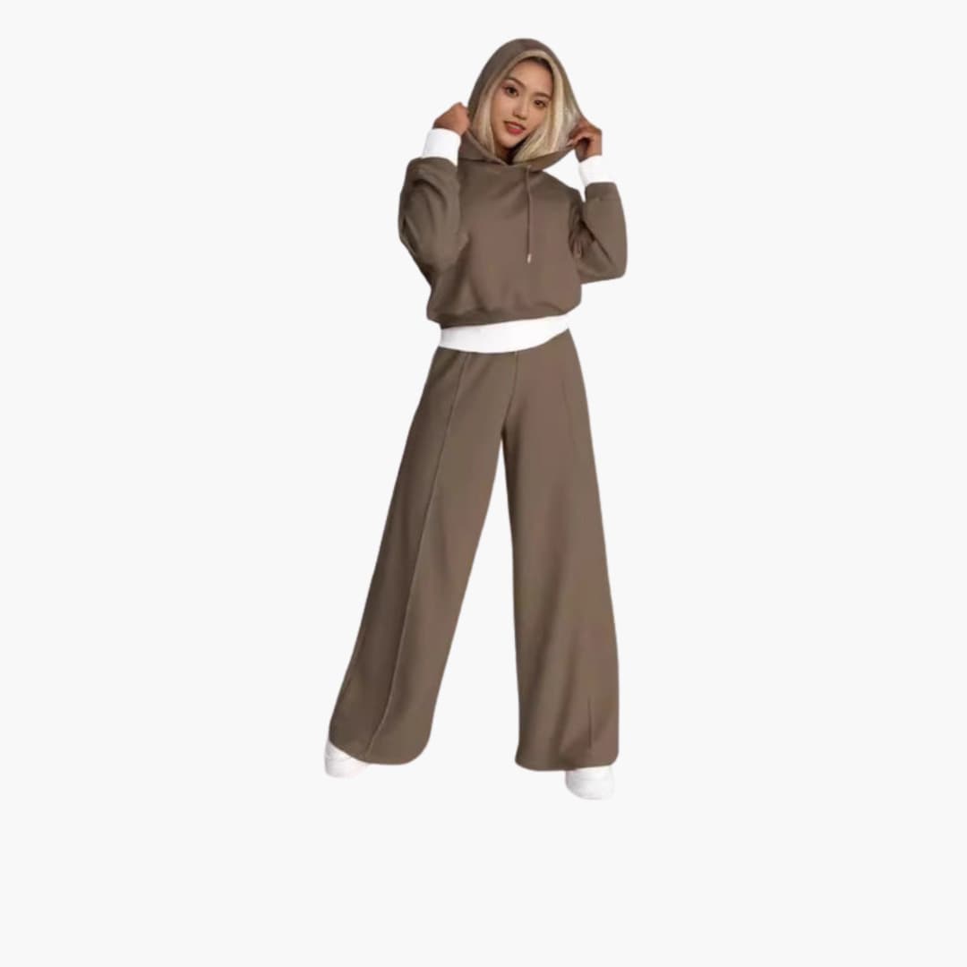 Detta damset inkluderar en hoodie med enkel halsringning, långa ärmar och rak fåll. Matchande byxor har elastisk midja, ingen synlig stängning, vida ben längs hela längden och raka fållar. Båda delarna har en enhetlig och slät yta över hela plagget.